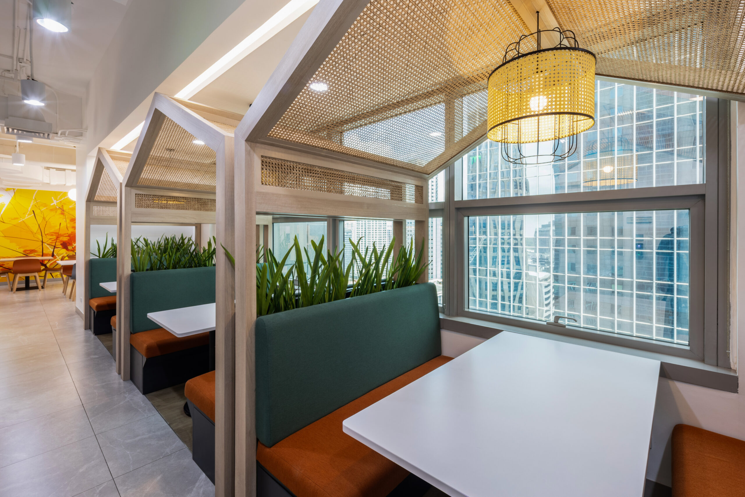 沿窗布置的半私密卡座,为专注工作或小型讨论提供了理想选择。藤编、绿植与暖色软装共同营造出安静而不封闭的氛围,在开放办公的同时取得私密性与协作性之间的平衡。