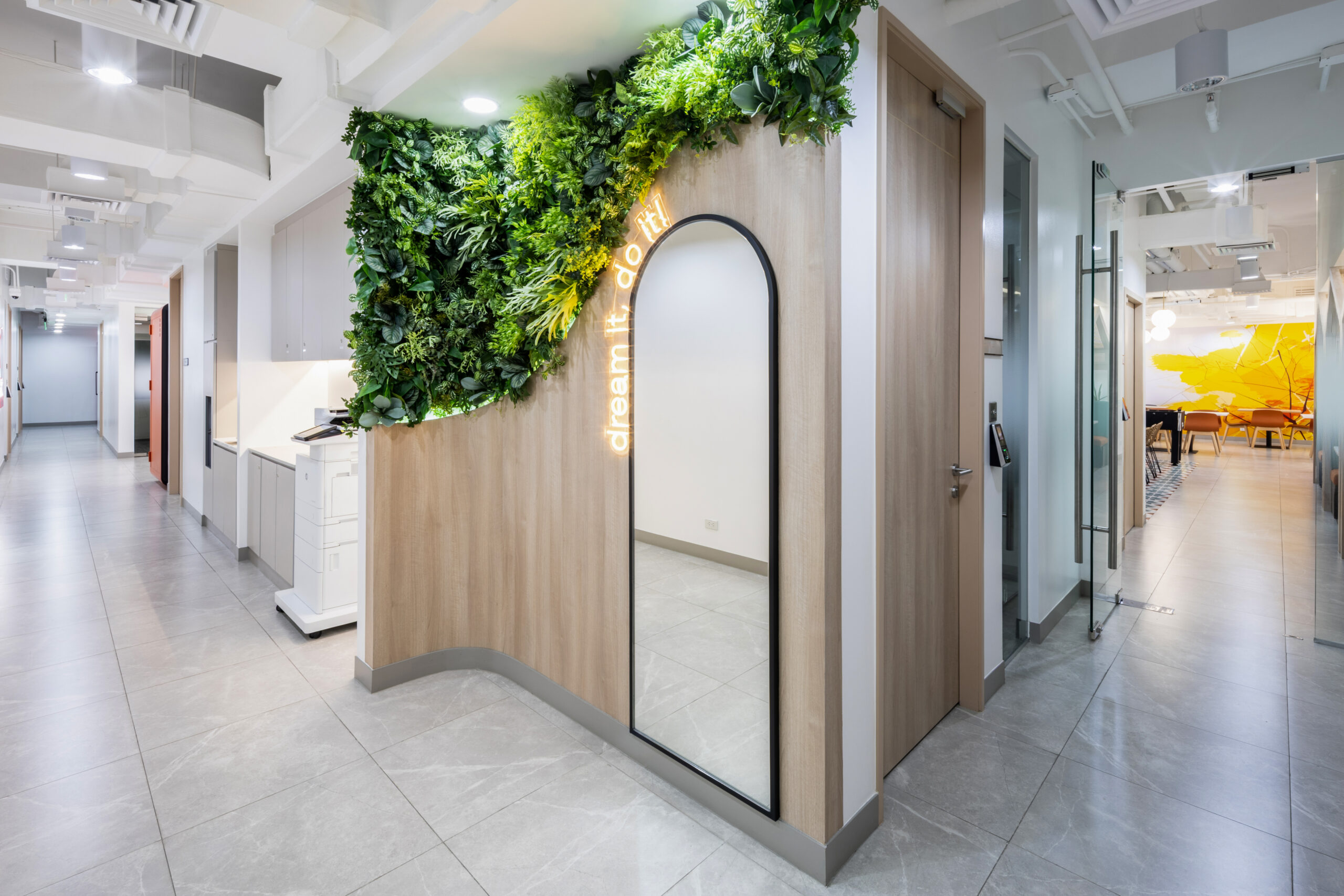 位于过渡走廊一侧的镜面角落,不只是功能节点,更是工作节奏中的一次视觉与心理的停留。被绿植环绕的全身镜与“dream it, do it”的灯光标语,传递出Atlas以人为本的价值观,鼓励员工保持觉察、积极与专注。