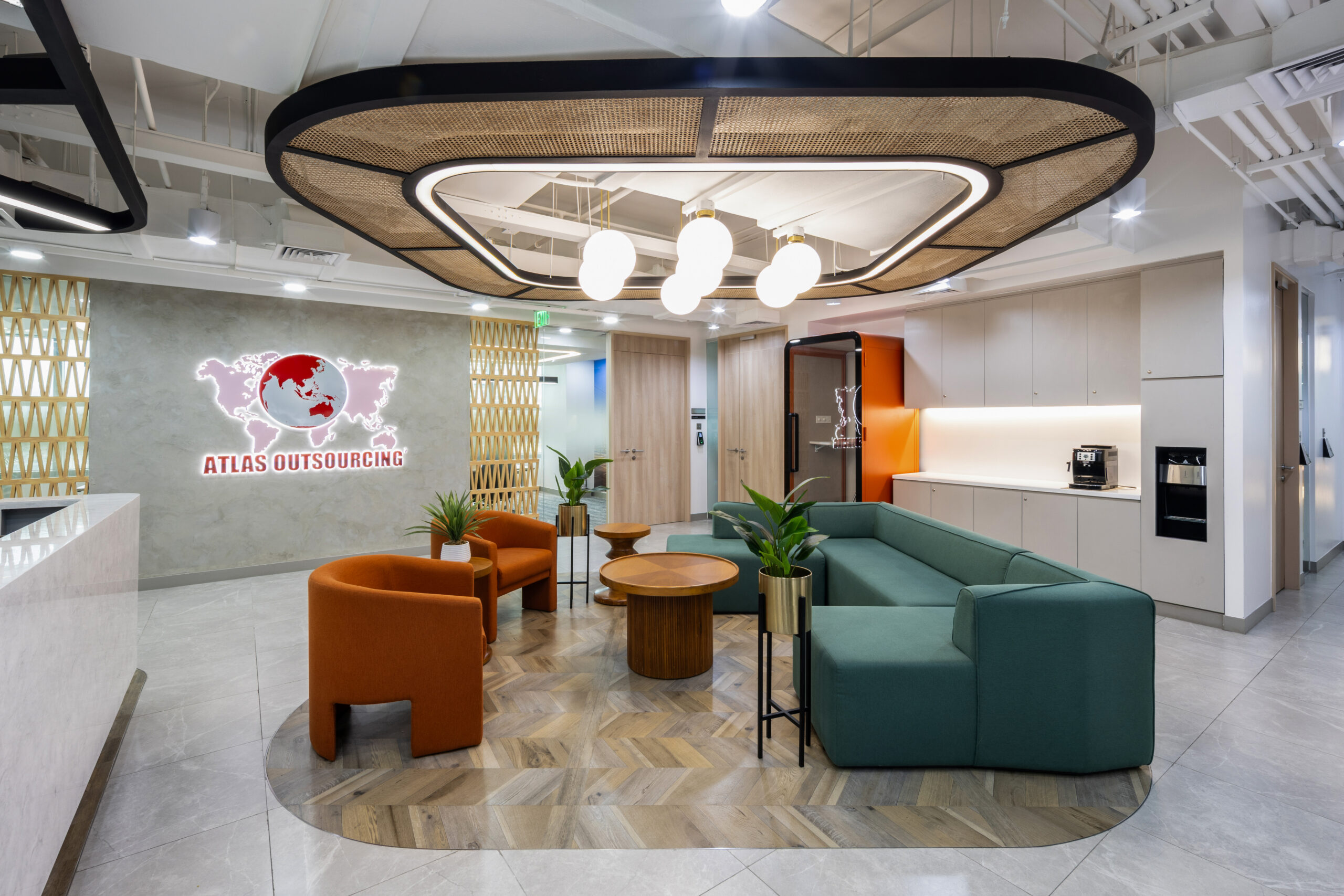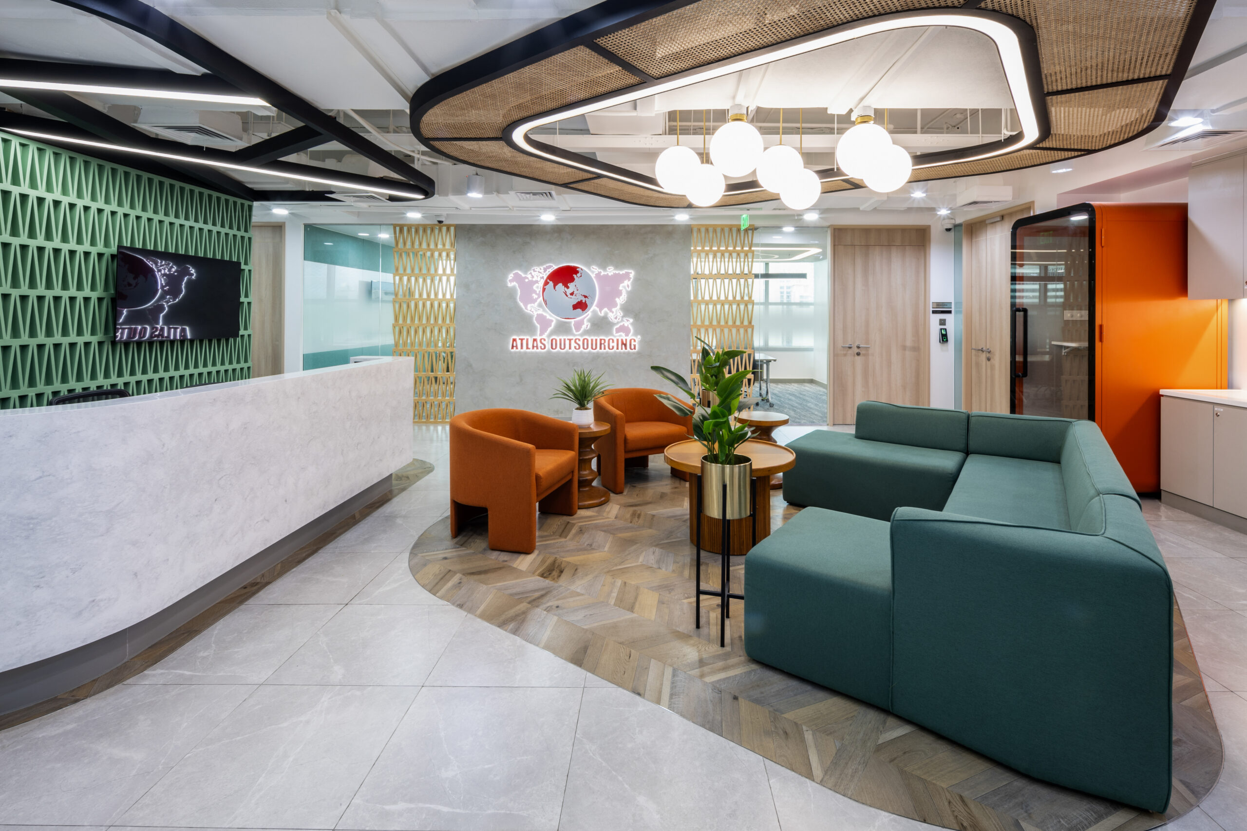 前台空间以克制而富有层次的方式开启体验。藤编镶嵌天花、富有肌理感的墙面处理以及源自本土文化的图案细节,共同营造出可触的与多文化交织的迎宾氛围。橙色与绿色的座椅搭配,在沉稳中注入活力,塑造出专业而亲和的第一印象。