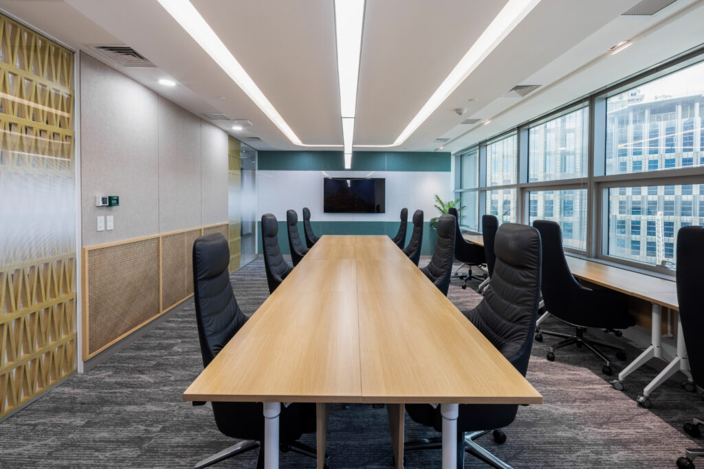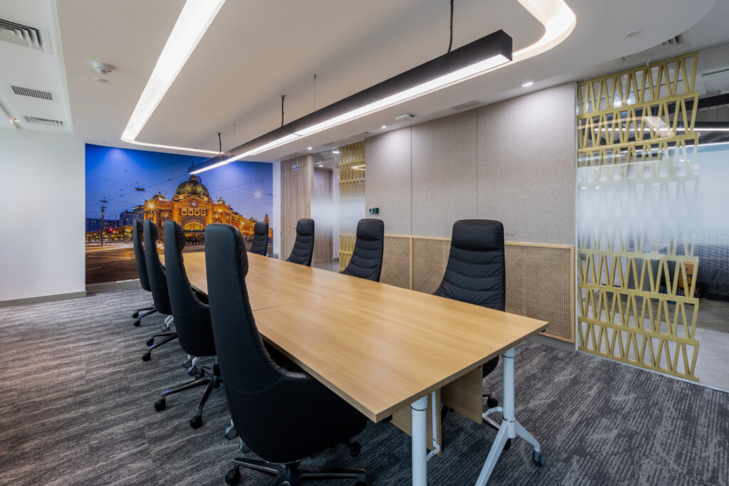 这一共享办公空间以强适应性为核心设计理念。日常作为开放式团队办公区使用,在需要时则可迅速转化为会议室。模块化办公桌与集成视听系统支持不同使用场景的切换,声学墙板提升专注度,而藤编细节与墨尔本火车站主题图形相呼应,对应着Atlas Outsourcing的文化根源。