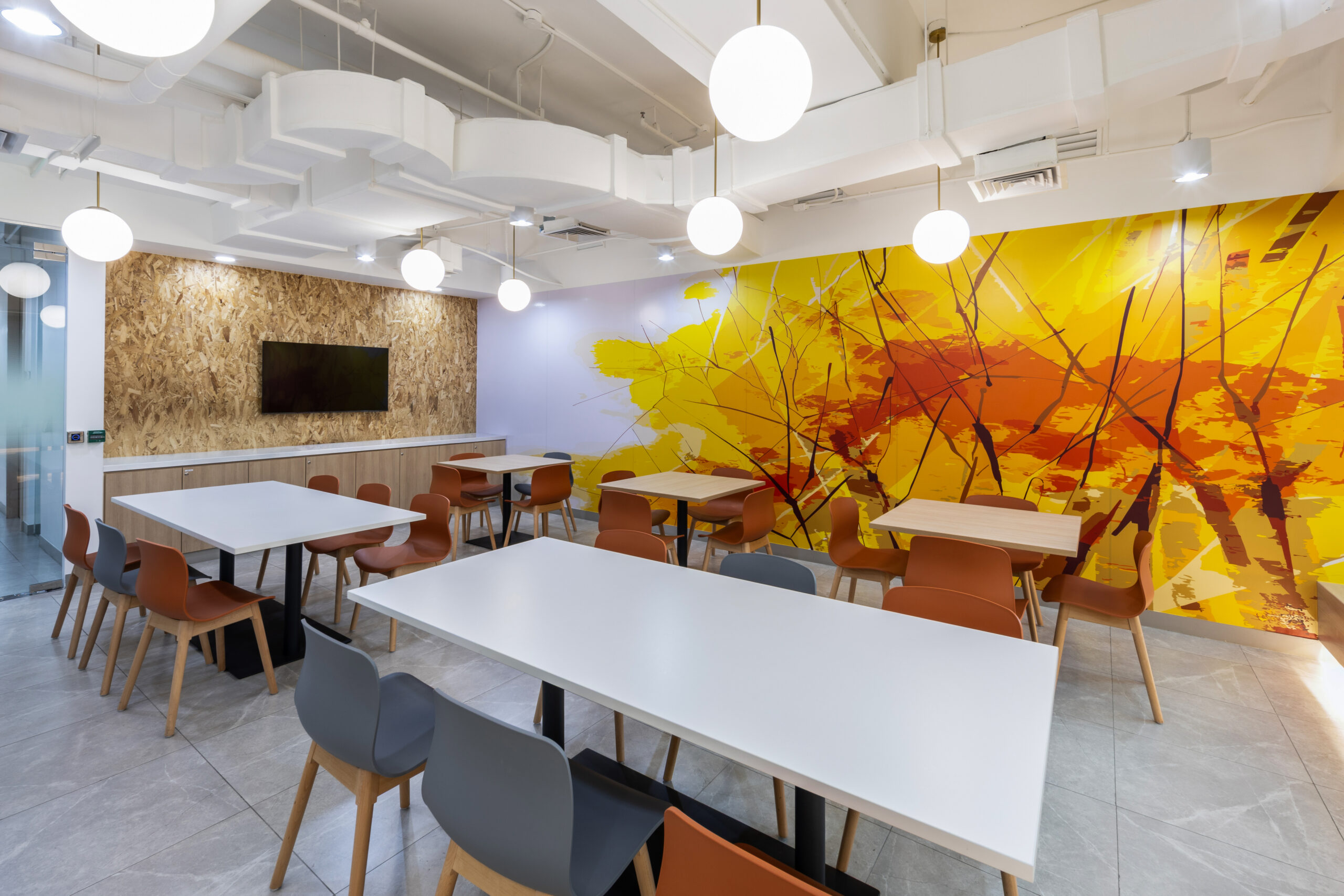 作为茶水区的延伸,员工餐厅不仅承担用餐的功能,也支持非正式会议与日常社交。橙色与黄色的点缀为空间注入活力,多样化的座椅形式提升使用的灵活度。自然肌理与大胆图形的结合,让这里成为办公空间中最具凝聚力的场所之一。