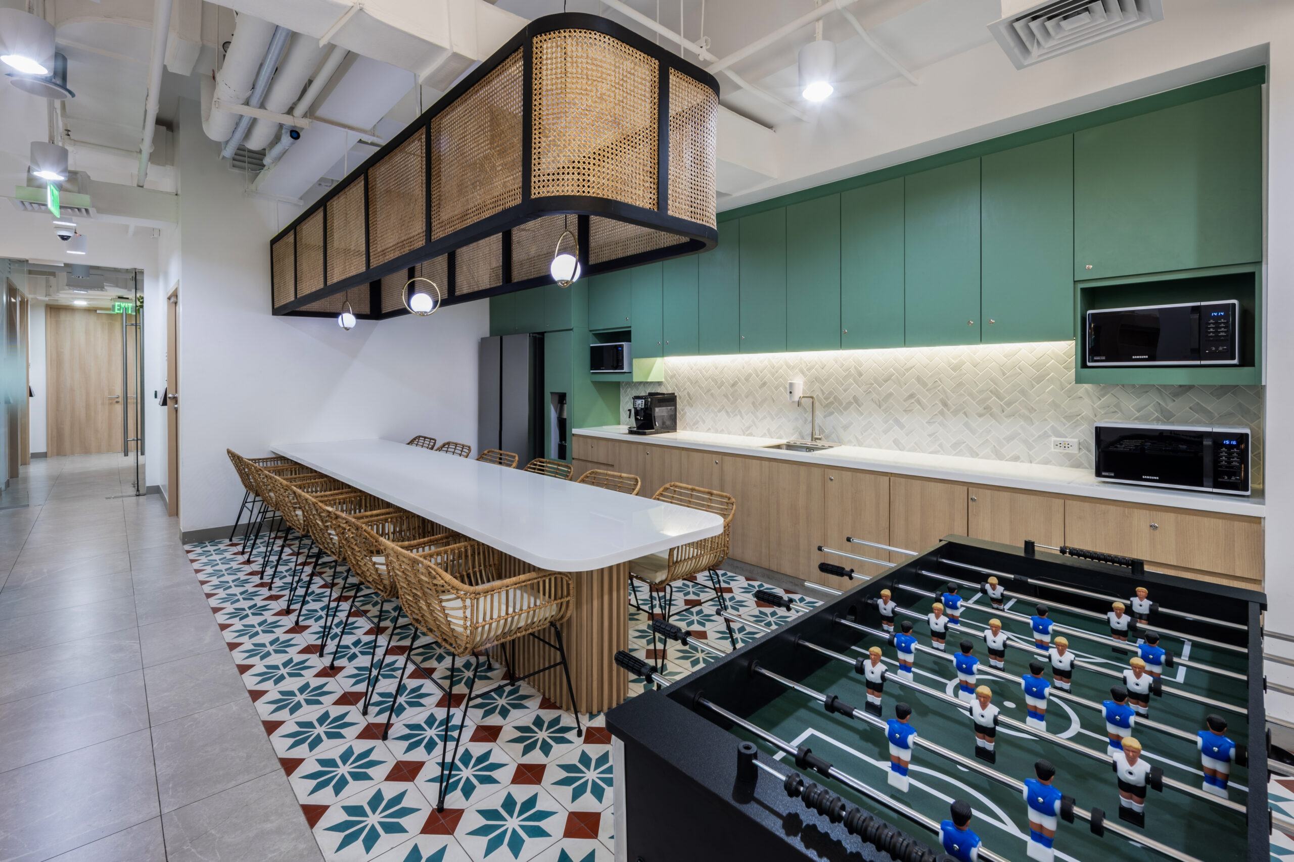 该岛台茶水区作为办公空间的社交核心,为员工提供一个可以停留、交流与放松的场所。藤编灯具、竖向线条饰面与石英台面在材质与色调上形成平衡,自然材料与手工细节的运用,使空间既沉稳又令人愉悦。