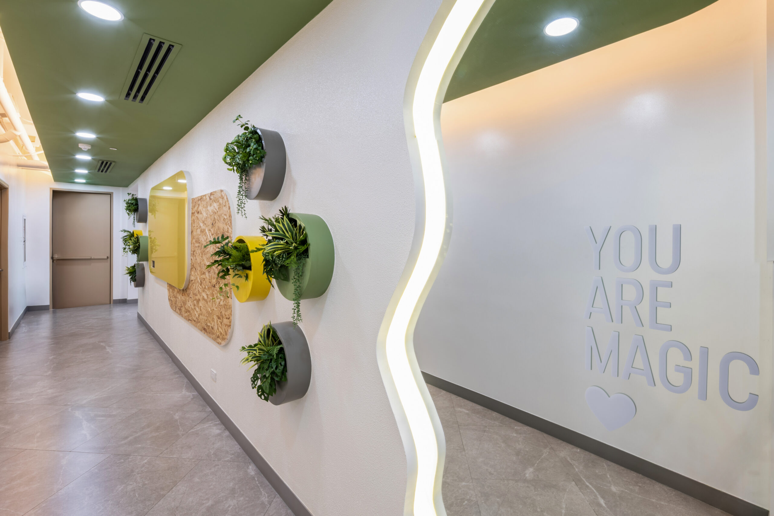 Set along a transitional pathway, this feature wall infuses vibrancy into everyday movement. A mix of circular planters in earthy greens and yellows introduces biophilia, while a wavy full-length mirror and positive affirmation wall transform a simple corridor into an uplifting journey. Organic forms and soft colours reinforce the brand’s human-centric ethos.