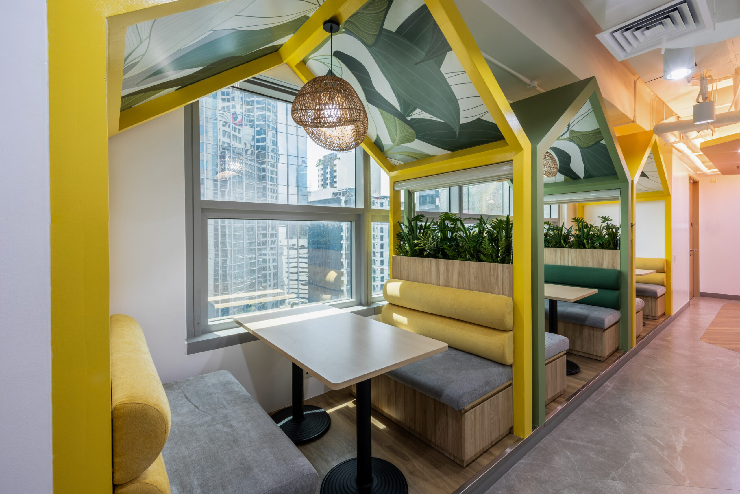 These booth-style collaboration pods provide semi-private settings for team huddles, brainstorming, or casual catchups. Bright hues, leafy ceiling graphics, and playful “house” forms add both character and comfort. Upholstered seating, layered planting, and daylight-filled corners foster focus while maintaining the nature-inspired design language.