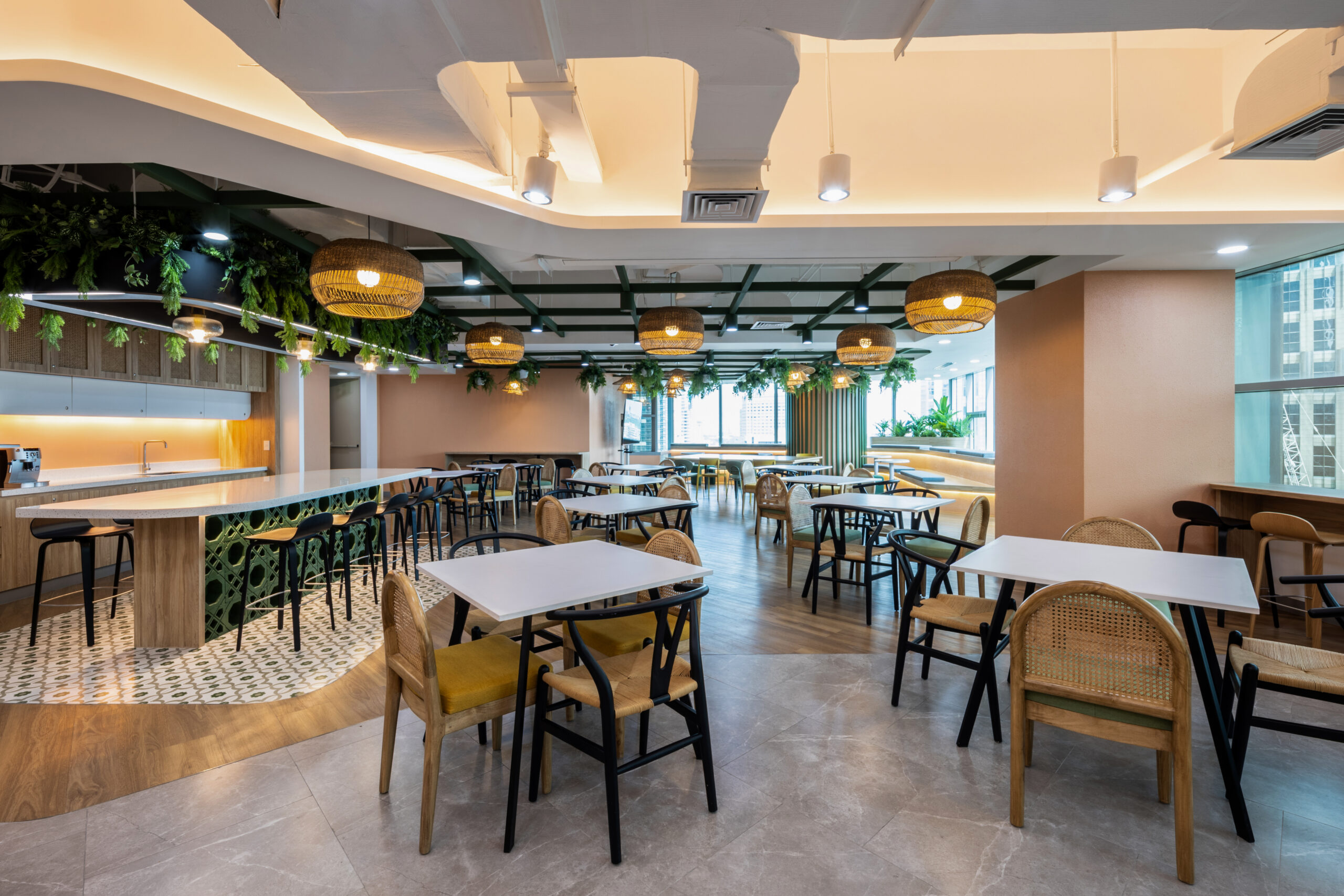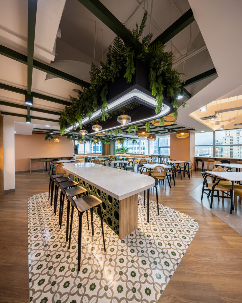 The expansive pantry and breakout area merge café culture with local traditions, offering a vibrant yet relaxed setting to dine, unwind, or collaborate. Woven rattan chairs, tropical greenery, and patterned tiles infuse Filipino flair, while warm lighting and layered textures create a grounded atmosphere. Flexible seating supports a range of interactions, from solo coffee breaks to lively team lunches, blurring the line between work and rest.