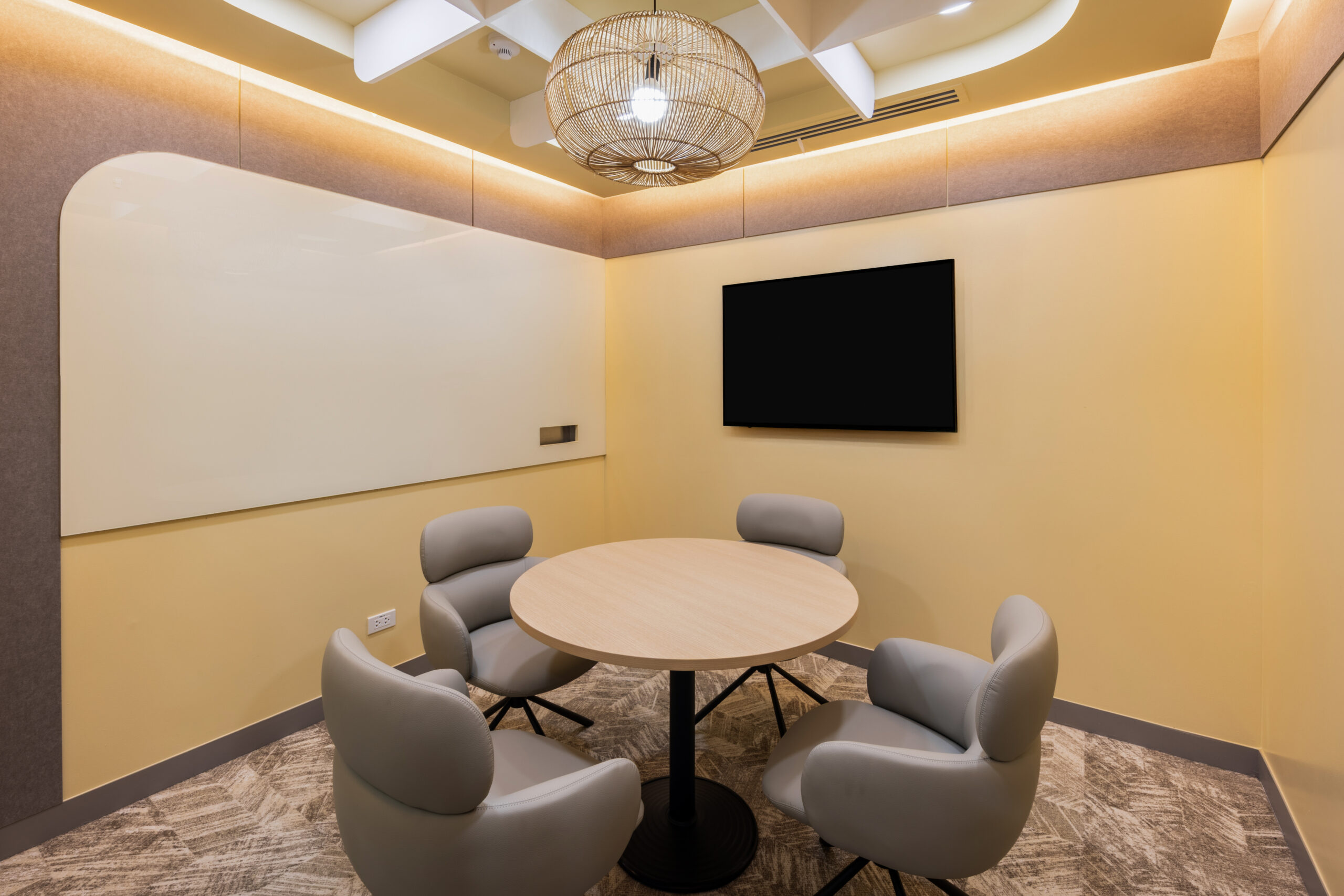 This compact meeting room offers a calm setting for focused discussions. A soft yellow palette sets a warm, non-intimidating tone, complemented by woven lighting, acoustic panels, and plush seating. The circular table fosters equality and openness, while the integrated technology supports productivity without distraction.