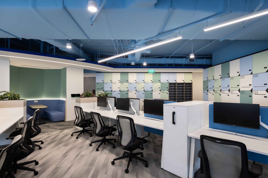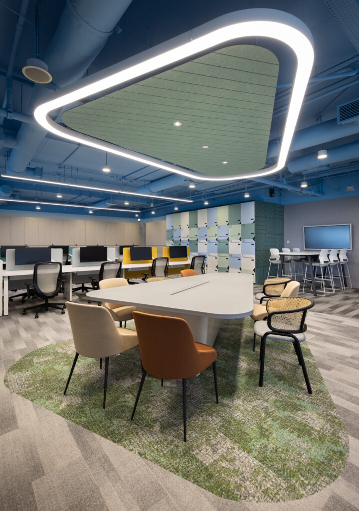 整体的工作区域在设计过程中充分考虑专注性的需求,与此同时融入自然灵感以创造宁静安稳的氛围。柔和的蓝色、绿色以及中性色调贯穿于工作站与储物柜面板,形成和谐统一的视觉效果,有效缓解感官疲劳。