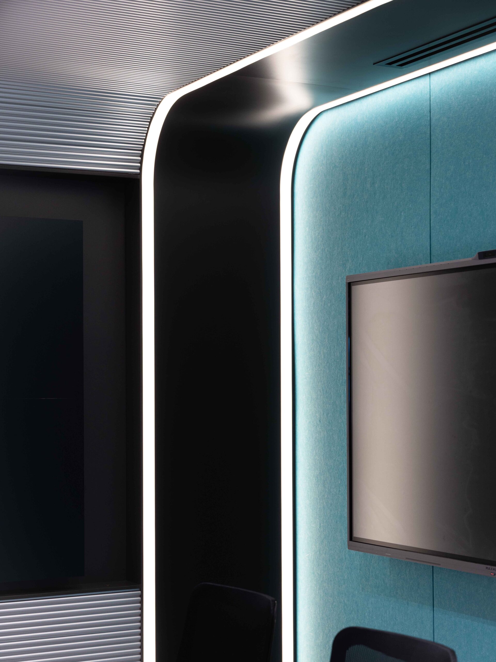 会议室以金属饰面包覆天花,呈现出具有精致利落的未来感氛围。金属质感柔和折射光线,凸显锐利几何线条,传递出精准、清晰与创新的理念。这个专为战略对话打造的空间配备了全套现代化通讯工具,全力支持科技驱动的思维模式。