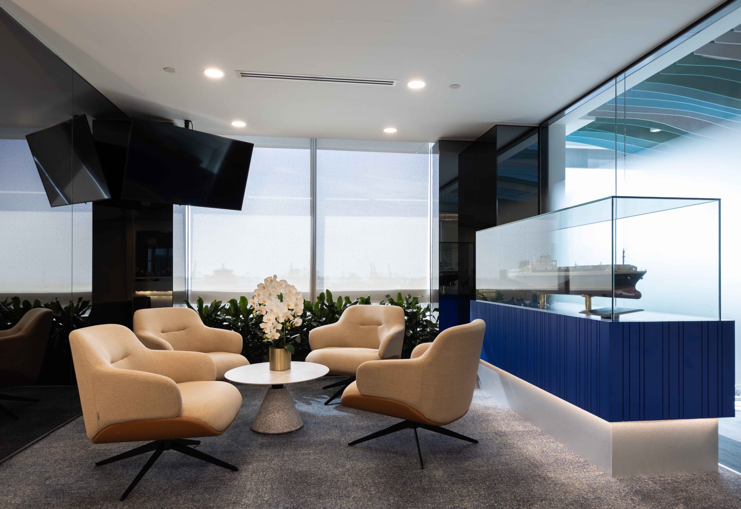 接待区的天花造型大胆而优雅,仿若海洋洋流的流畅曲线,象征着全球贸易航线的活力与联通性。定制柜台以船舶造型为灵感,精湛的工艺既彰显稳健的力量感又带着优雅韵味。
