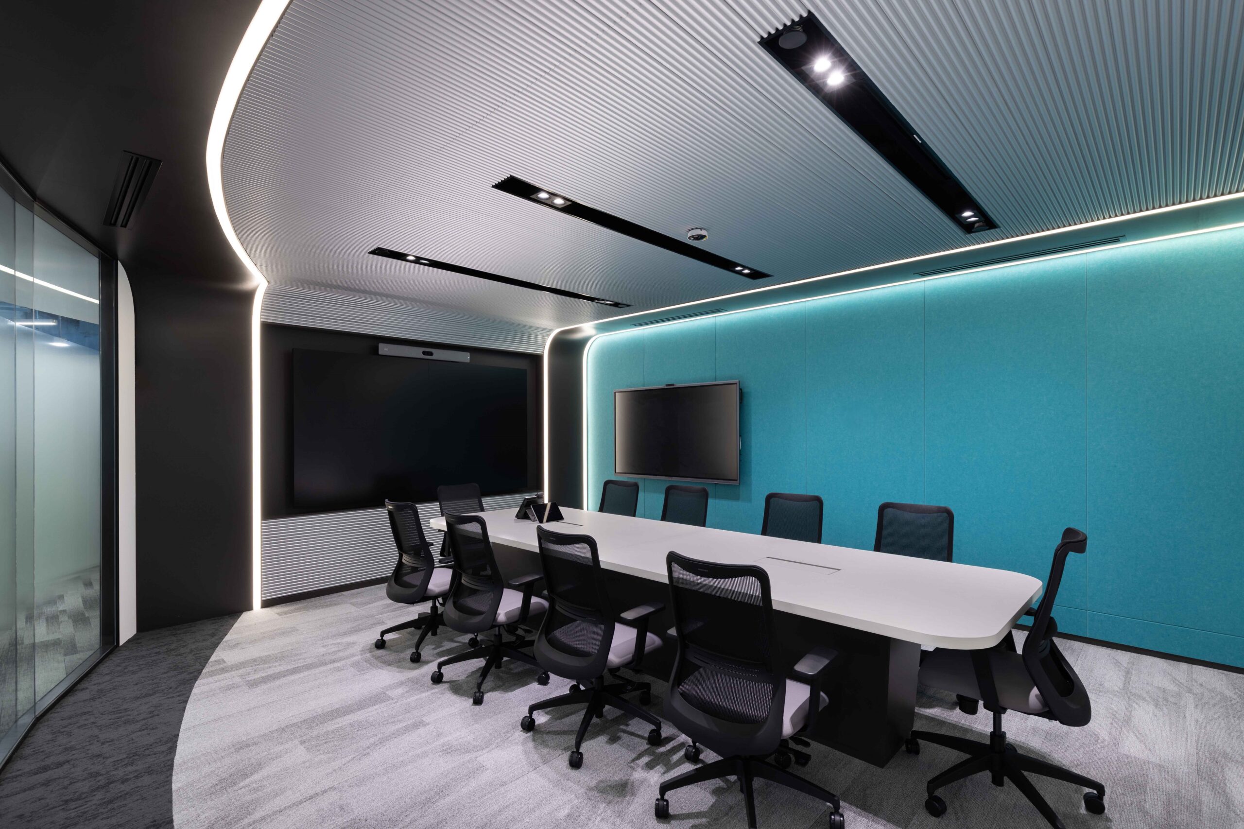 波浪造型天花与精致饰面营造出宁静而专注的会议环境。