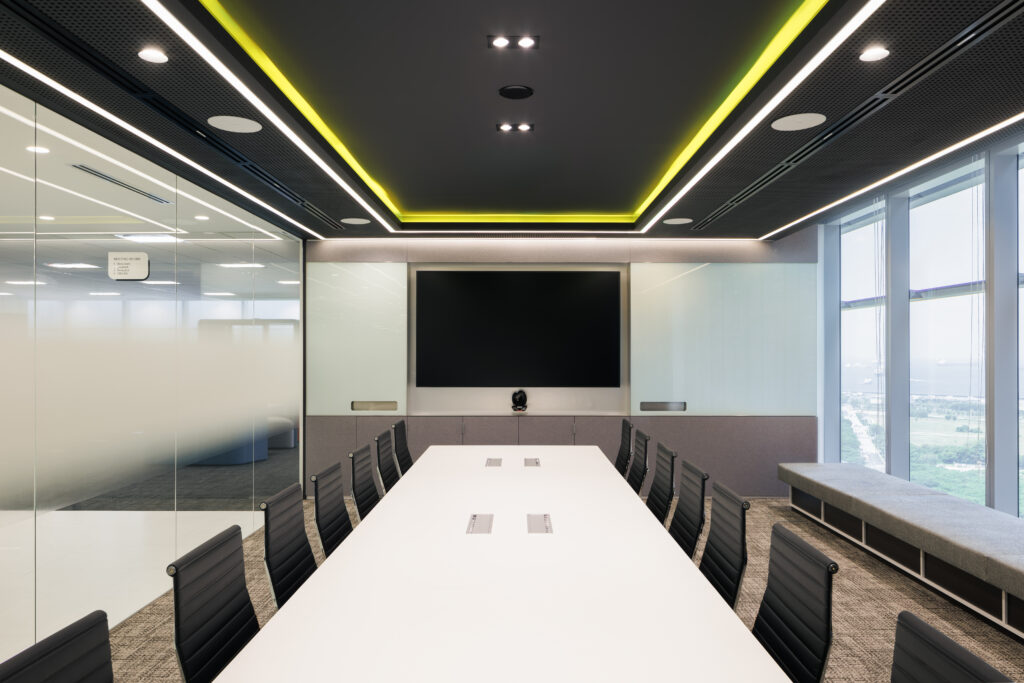 董事会议室采用弧形玻璃窗,提供连接性,采用多孔天花板,提供视觉趣味,霓虹灯营造出充满活力的协作空间。