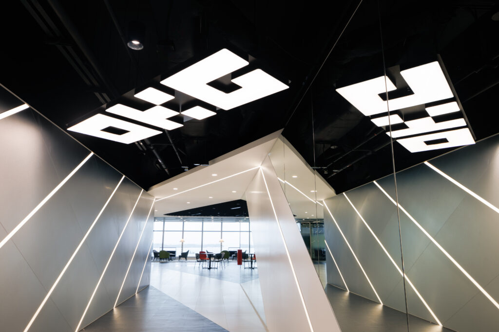 体验式走廊被设计成一个未来主义的胶囊,高耸的墙壁与有节奏的交易节拍产生共鸣。在上面,logo标志像数字心跳一样跳动,优雅地蚀刻在天花板上的光线下。这个身临其境的环境不仅吸引着参观者,还体现了创新的动态能量,创造了一个反映品牌精髓的感官之旅。