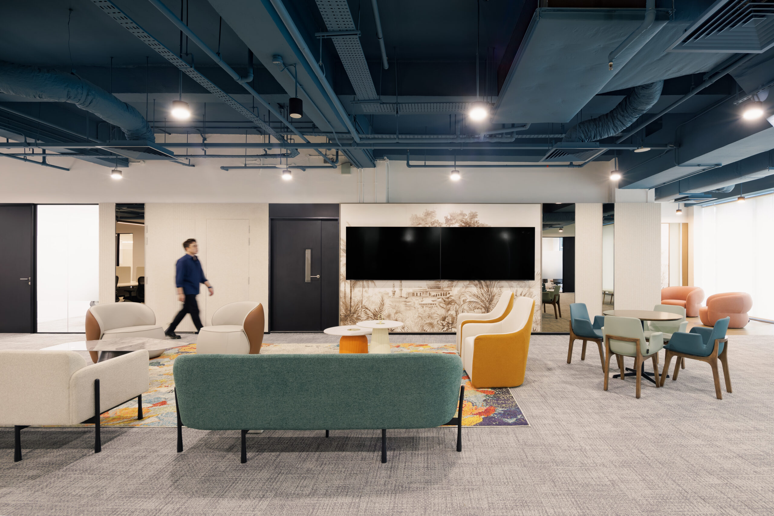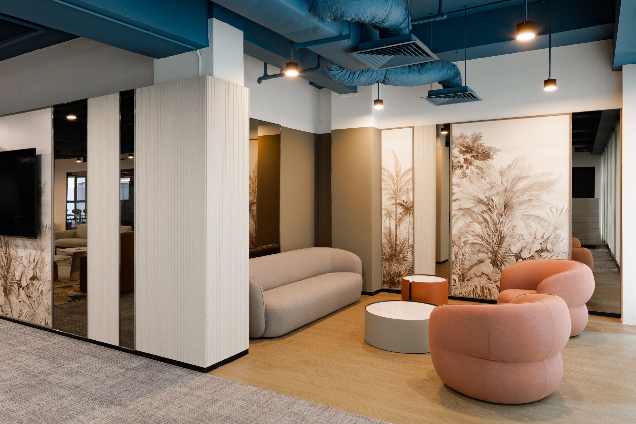 该空间将过去和现在完美地融合在一起。描绘新加坡丰富遗产的怀旧图案和墙面艺术为空间增添了一丝温馨和特色。这些视觉元素营造出一种与城市历史和文化相联系的感觉,使该空间不仅仅是一个工作场所。