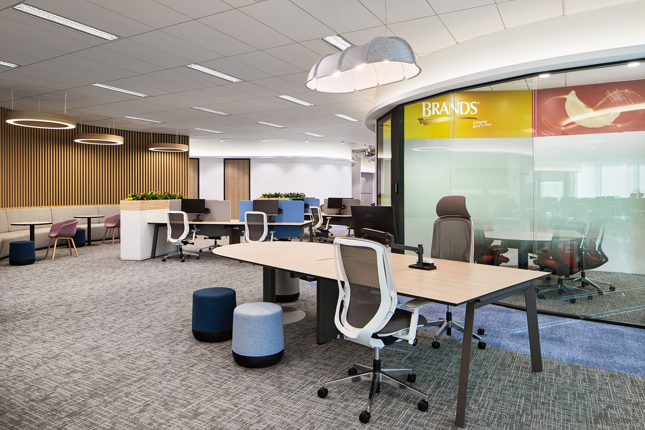 与将办公室分割成孤立区域不同,我们的计划拥抱了迎合不同需求的交织区域。受到Suntory产品颜色和新加坡的公共住宅的启发,这些区域采用了蓝色、黄色、紫色和绿色等生动色彩。