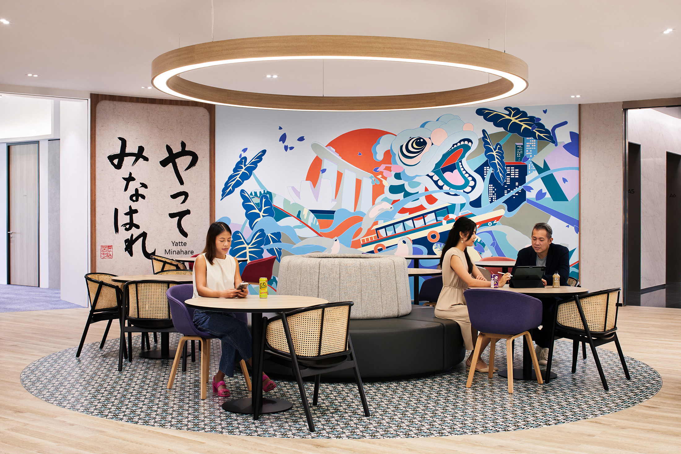 “Yatte Minahare”或“Go for It!”的书法表达——Suntory大胆梦想的精神——以及受日本启发的壁画为厨房增添了活力。