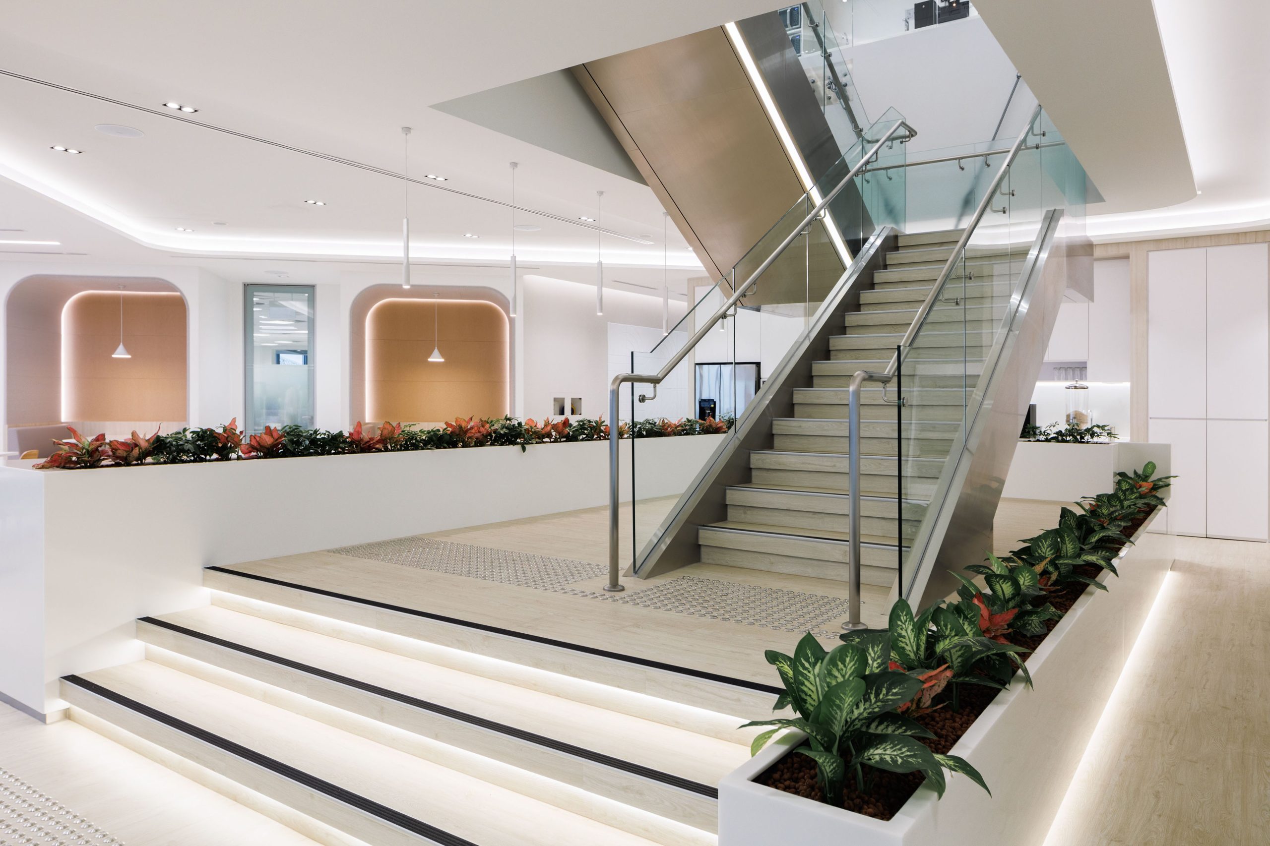 当他们在连接楼梯处穿越各楼层时,迎接他们的是一片宽大的蕨类植物床,为办公空间增添活力。楼梯是用玻璃板设计的,描绘了楼层之间的连接幻觉。它还允许自然光自由地涌入空间,创造一种开放的感觉。