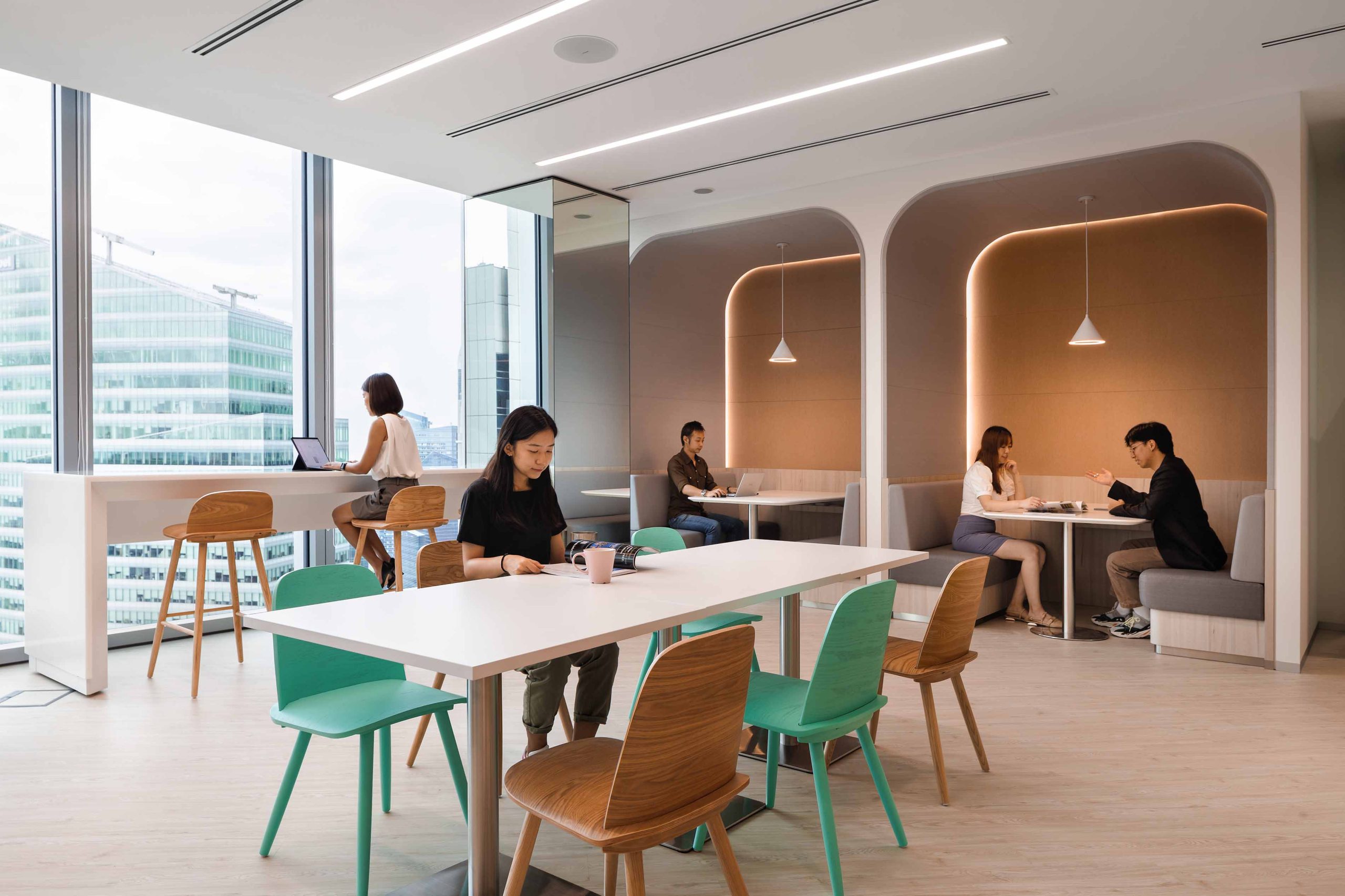 这个空间提供了多种座位选择–酒吧柜台座位、桌子座位、卡座座位和沙发座位。喜欢自然光的员工会倾向于靠窗的座位,而卡座则是那些喜欢半私人环境的人的选择。