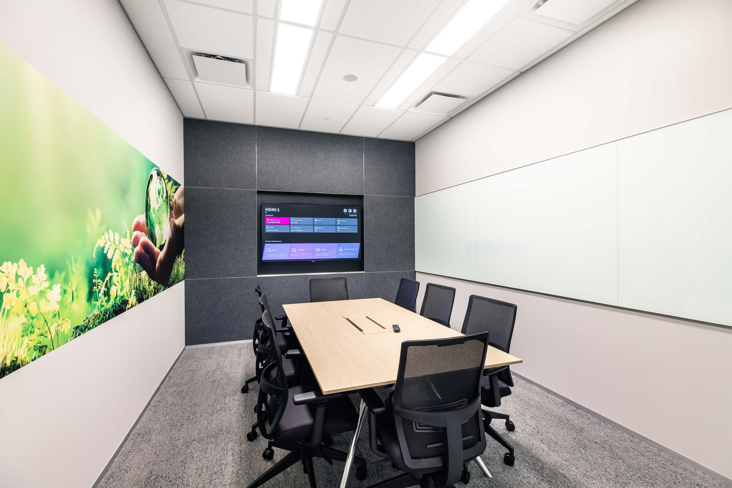 私人会议室有非正式和正式两种不同的风格。非正式会议室配备休闲椅、办公椅和一个柜台桌,可以放置笔记本电脑并进行讨论。其他会议室则配备了集中的会议桌和符合人体工程学的椅子,用于正式讨论。这些房间还配备了智能视频会议硬件,以支持与全球办公室或外部合作伙伴的会议。