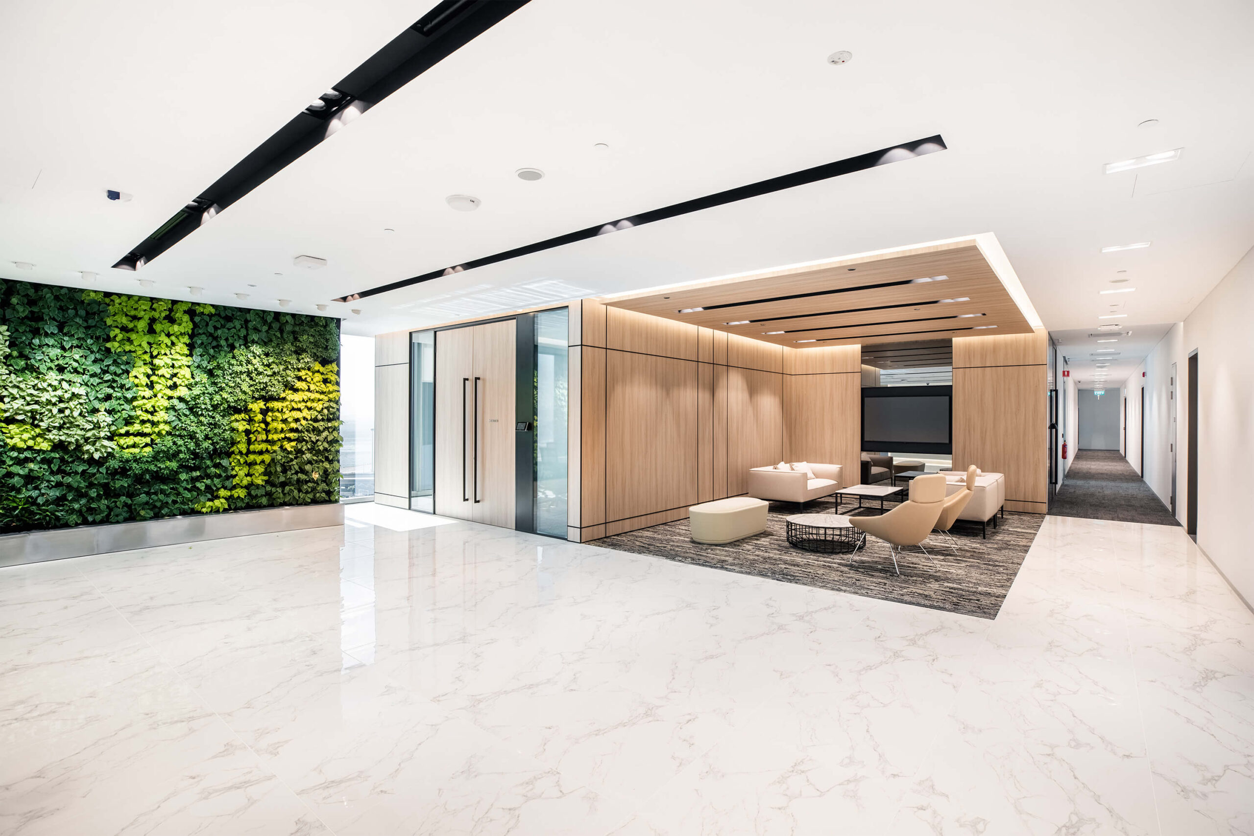 走出电梯,便可轻易辨认出办事处的主入口——一面醒目的绿植墙迎接着每一位访客。这面特色墙在周围的淡色调中显得格外突出。绿植墙的左边是一个优雅的精雕固态台面分层接待台,方便分别服务站立和就坐的宾客。