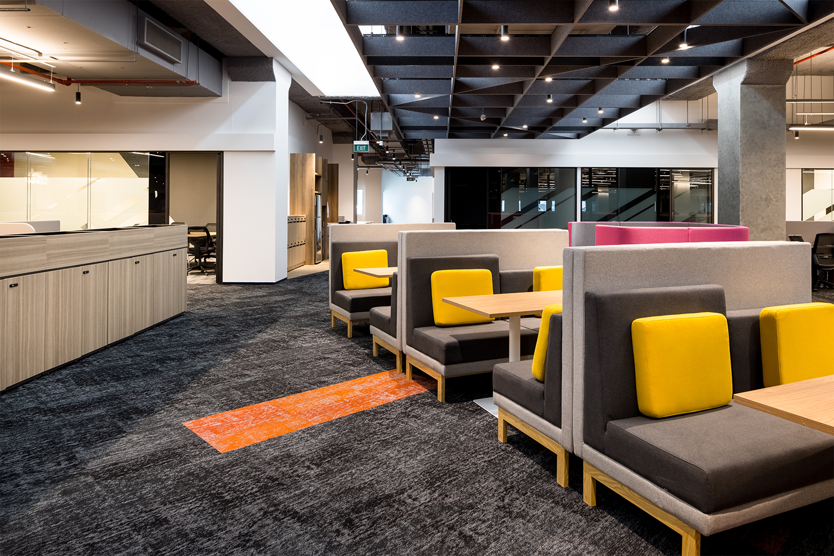 设计团队还与ASM紧密合作,了解品牌和他们的内部营销目标。为了确保每个人都对ASM的新品牌元素有直观的体验,DB&B经过深思熟虑,在空间中加入了粉色、黄色和橙色等重点色彩,以配合ASM新推出的品牌指南。同样,受ASM标志启发的对角线编织图案被应用于整个工作空间的墙面、柜台、地毯甚至是天花板设计。