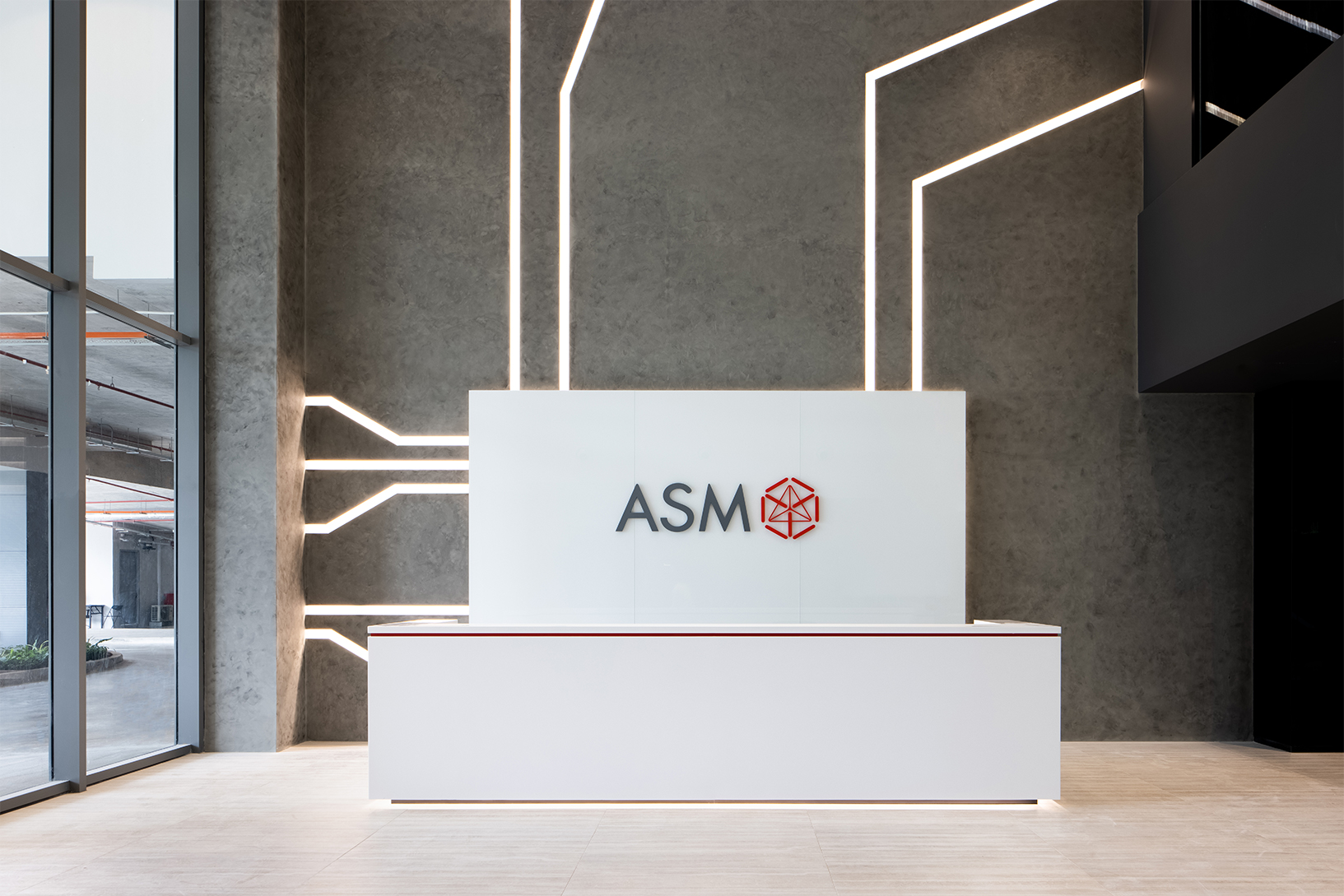 ASM大楼的入口设计为一个令人印象深刻的双层玻璃入口,通向前台区域。前台的空间给人以错觉,仿佛空间是由玻璃入口处洒下的自然光以及挑高的天花板创造的。以电路板为灵感精巧设计而成的背景墙可以巧妙地让访客们意识到ASM的专业领域,而这面墙同时也提供环境照明。背景墙与优雅的前台固态台面材质搭配,延伸到两层楼间的夹层,指向访客会议室和培训室的方向。