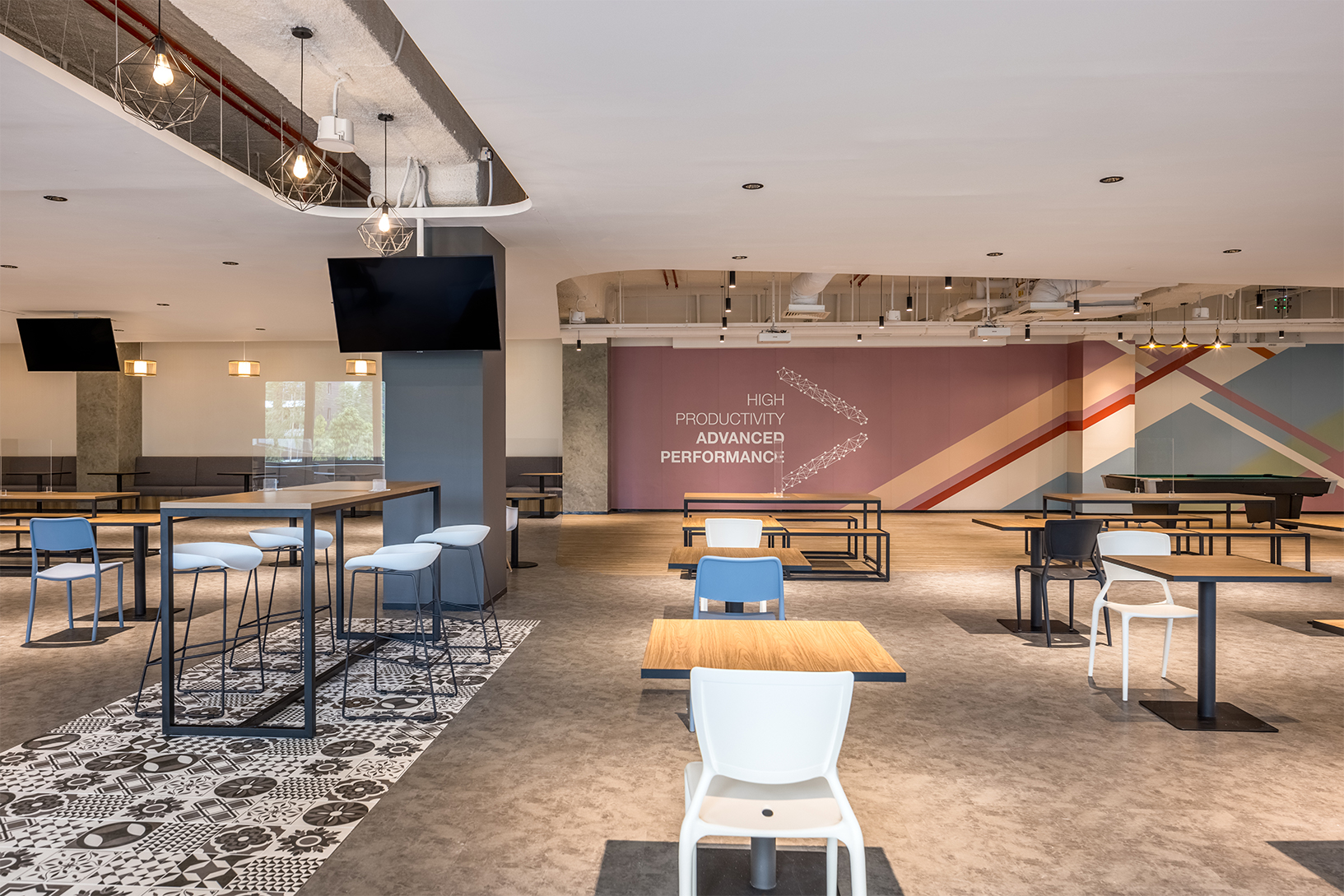 咖啡厅的空间设计令人印象深刻,同时可以容纳ASM不断增长的员工数量。此类空间曾经被认为只是一个吃饭的空间,现在已经成为全体会议、合作和社交的替代场所,提供多种座位选择——从共享餐桌到高脚凳和卡座应有尽有。为了提供空间划分,DB&B将重点色彩瓷砖与不同颜色的乙烯基地板混合在一起。台球桌和乒乓球桌也是经过深思熟虑的安排,可以让员工为自己的头脑充电。