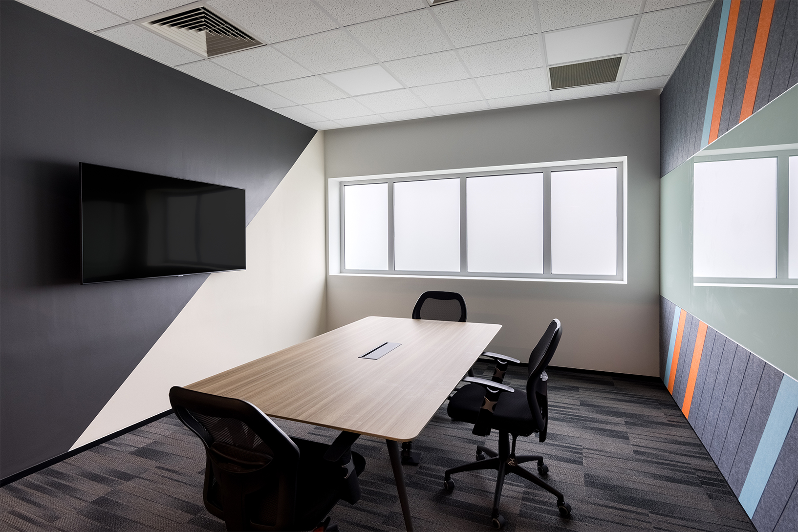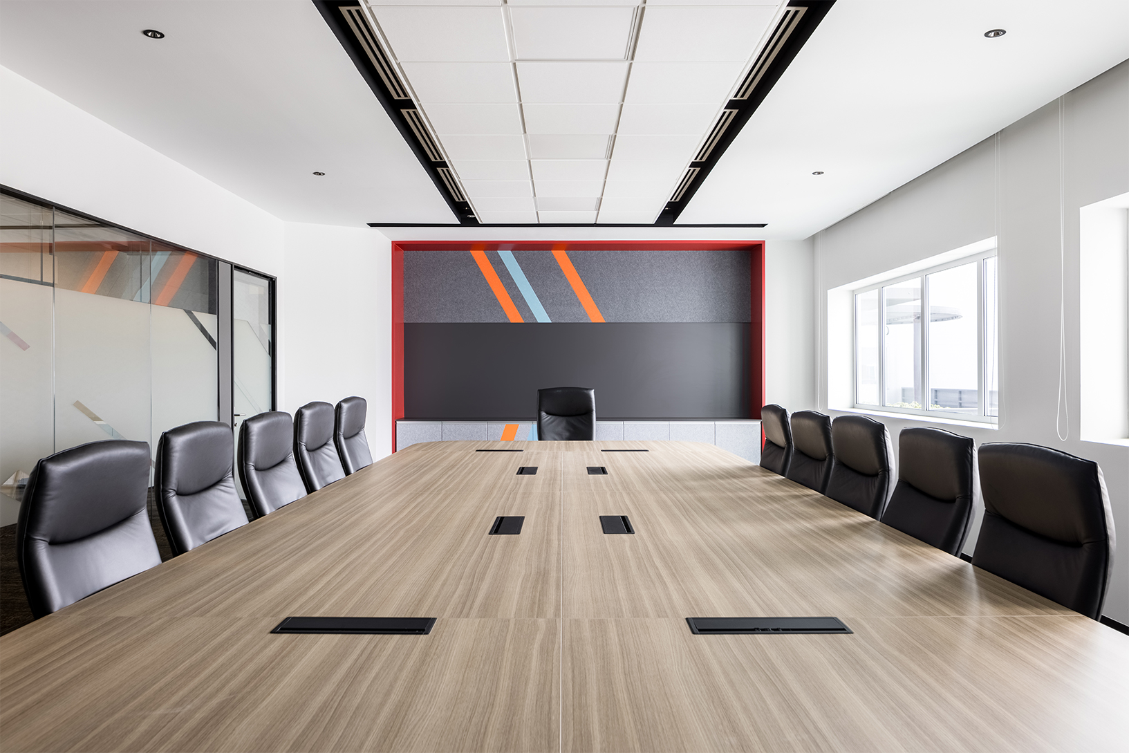 工作区域被一条醒目的彩色协作空间过道隔开,这条过道因此得名”交流空间”,为不同规模的团体提供了各种有趣的座位选择,使他们能够聚在一起进行讨论。这个空间位于建筑的顶层,通过一个设计巧妙的天窗和位于上方的吸音吊顶,还可以享受到自然光。