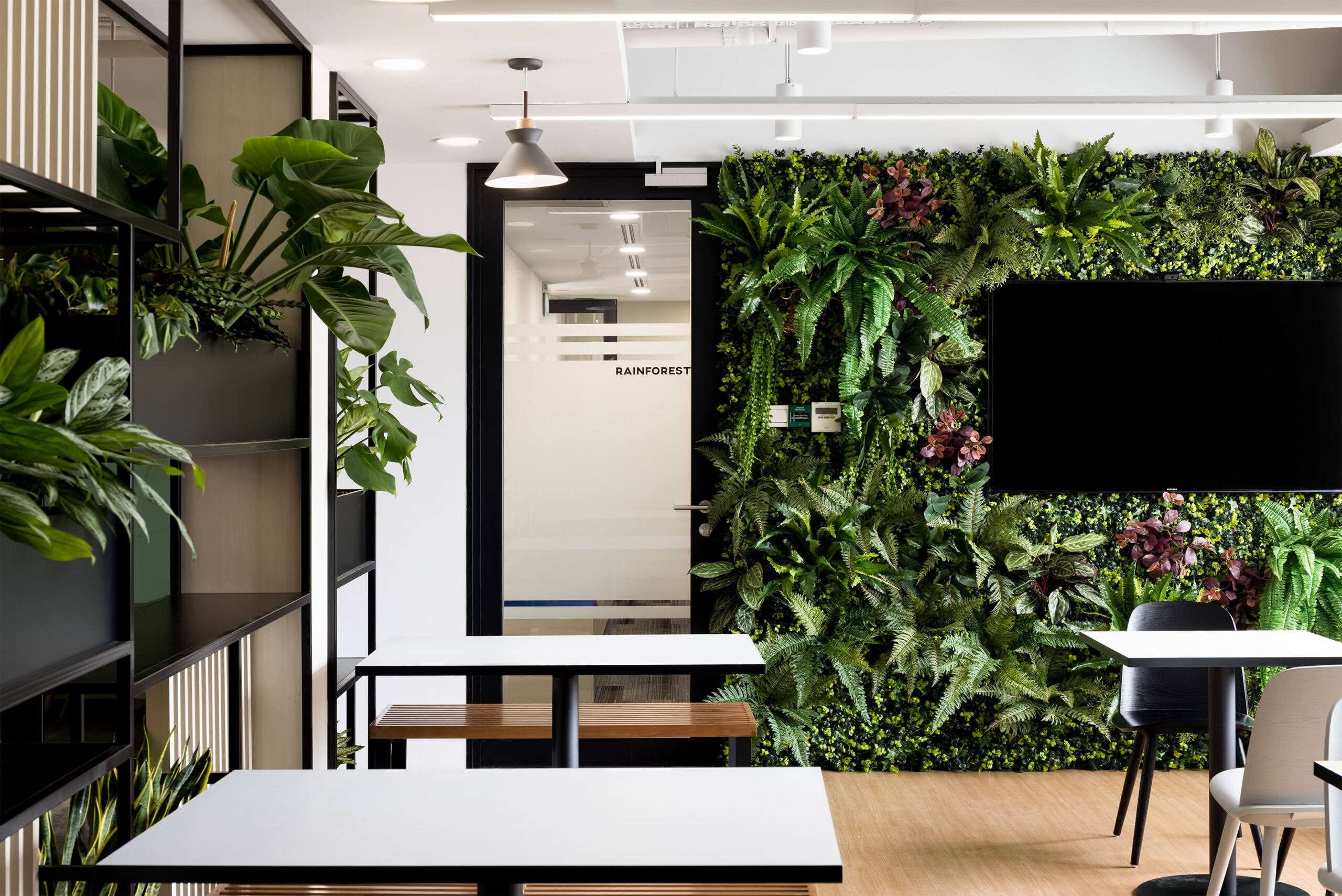 为了将亲生物引入办公空间,我们在食品储藏室空间设置了一堵植物墙。这片郁郁葱葱的绿色植物将自然带入工作场所,并使周围环境活跃起来。