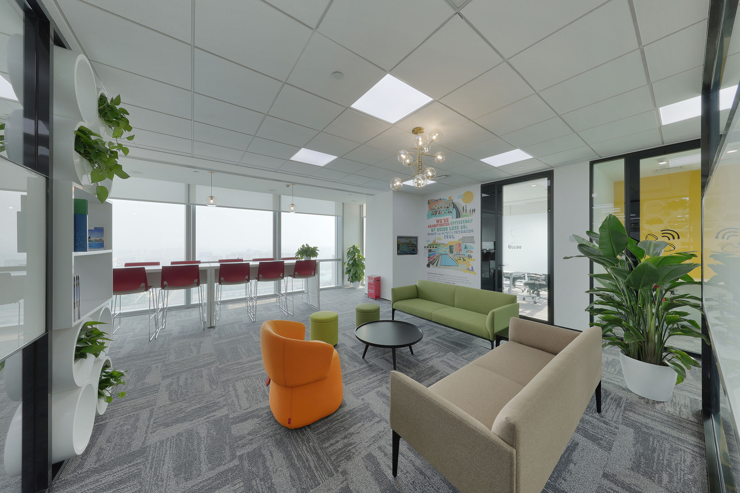 公共设计的核心是社交中心。DB&B构思的设计理念包括在办公空间中设置三个主要部分,代表威立雅的各个核心业务领域。以人流为重点的前台区域被命名为“水”。以食品、回收和更新为重点的咖啡厅被比喻为业务中的“废物”模块。以知识共享为重点的会议设施则被冠以“能源”之名。