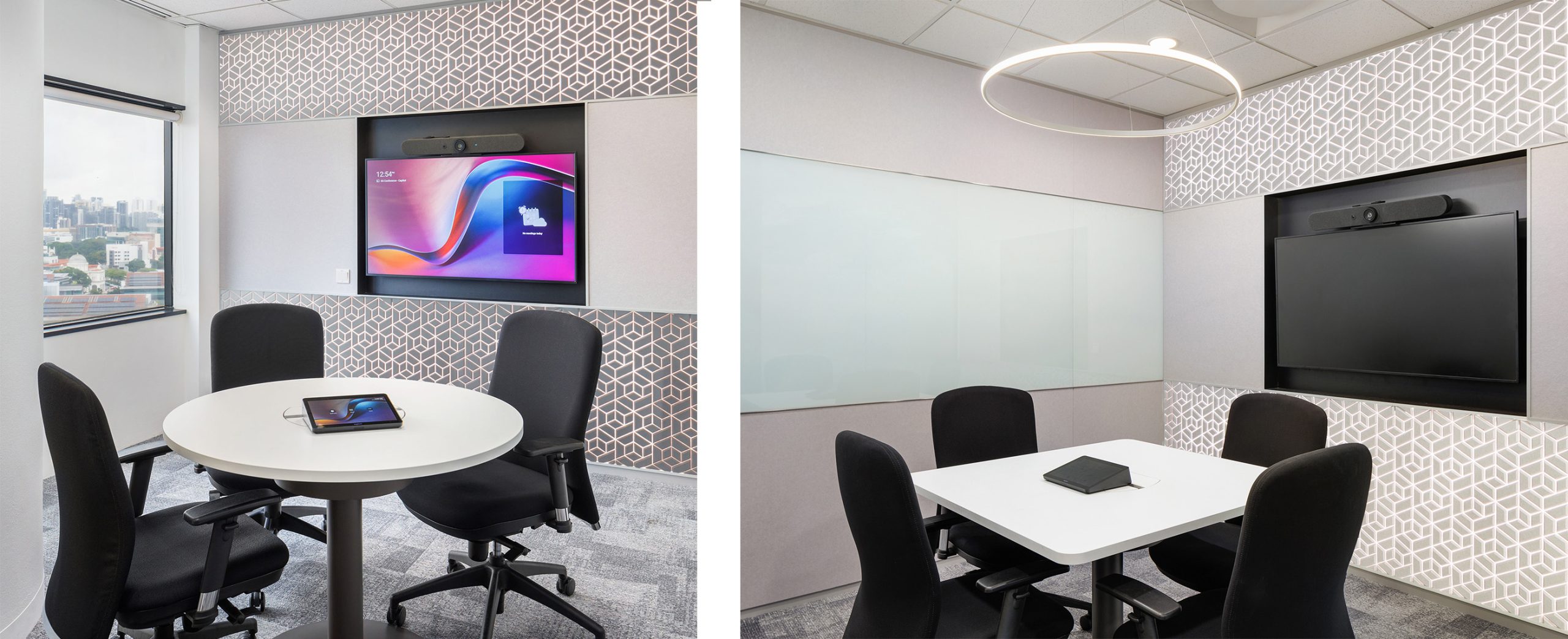 为方便后台办公室进行私下讨论,电话室、会议空间和私人办公室沿空间内围一字排开。为了给会议空间注入质感,房间内铺设了背光隔音板。