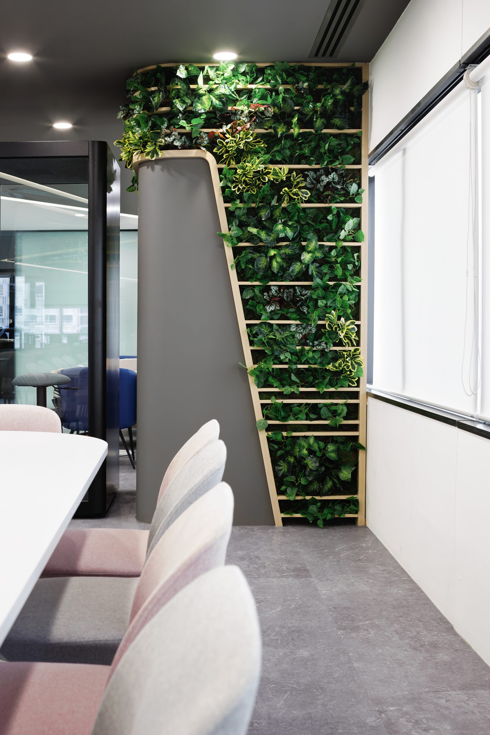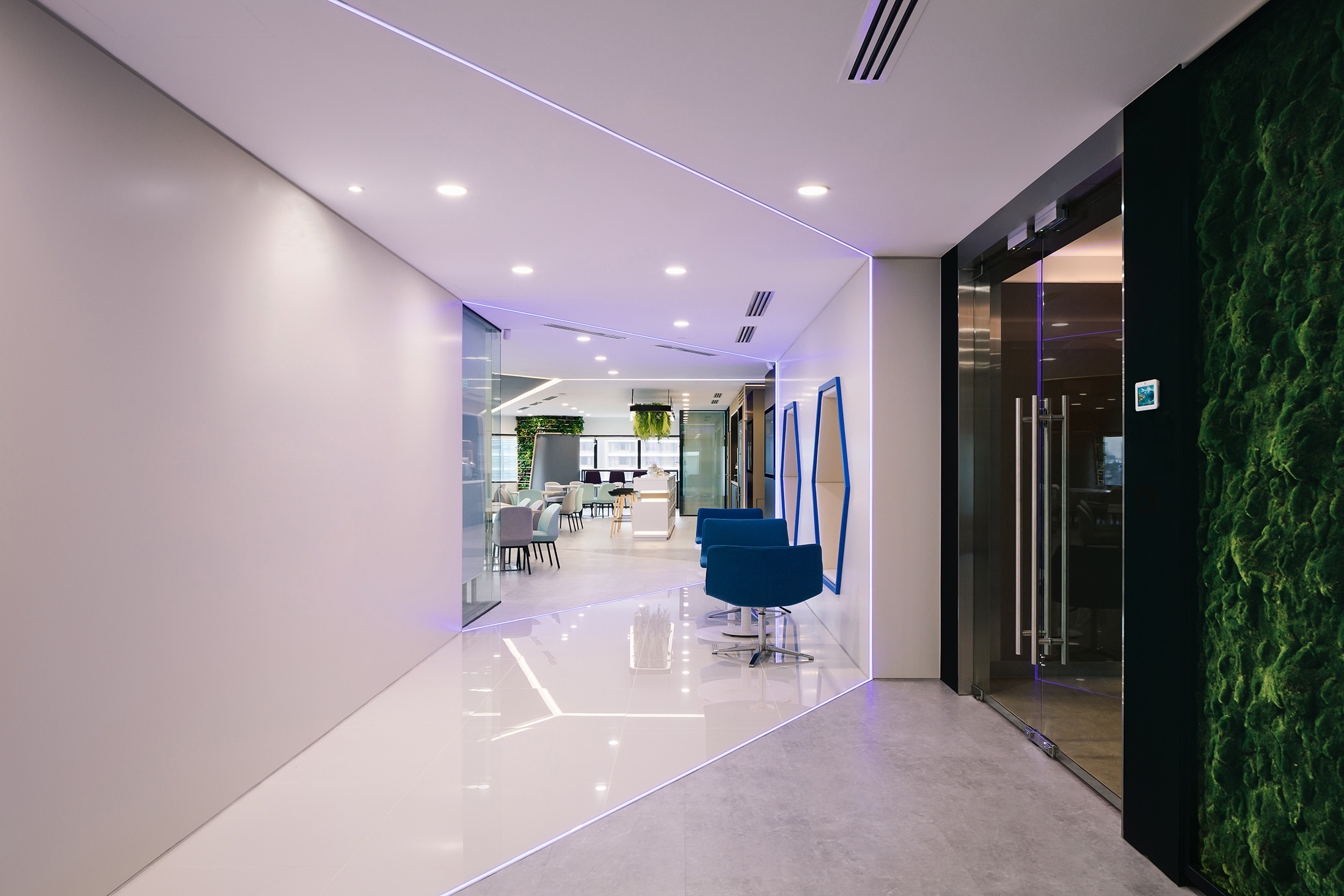在过去的 23 年中,他们在全球 16 个国家设立了多个地区办事处。DB&B 受其提供的一系列技术解决方案的启发,在前台办公室的设计中使用了嵌入墙壁的彩色荧光灯,散发出未来主义的气息。 为了突出这一概念,整个空间采用了六边形和光滑的灯带。