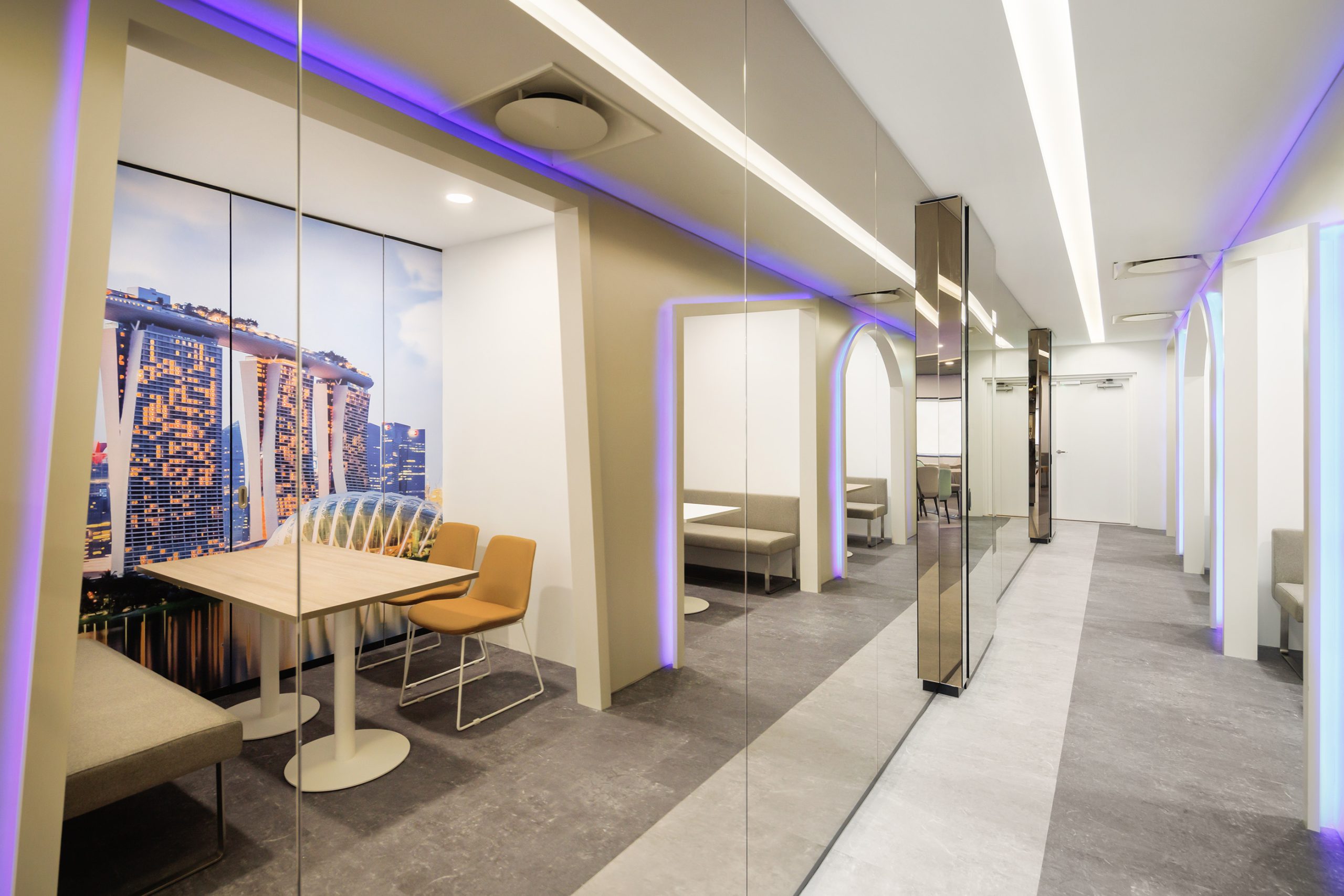 在半私密的讨论区,沿走廊设有独立的讨论间。包间座位的边框是新加坡、波士顿和以色列的地标剪影,这是对公司总部所在地的强烈暗示,反映了公司的全球影响力。