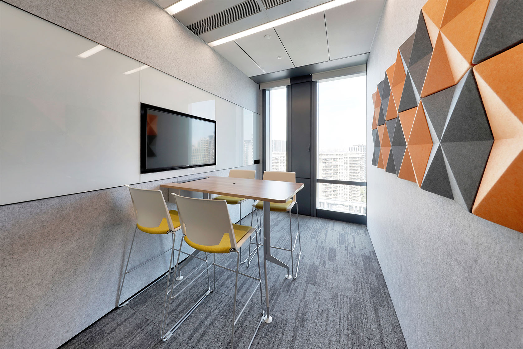 In an open plan office, it’s also critical not to undermine noise levels. By introducing suspended echo panels at collaboration and discussion areas, this will improve on sound absorption.