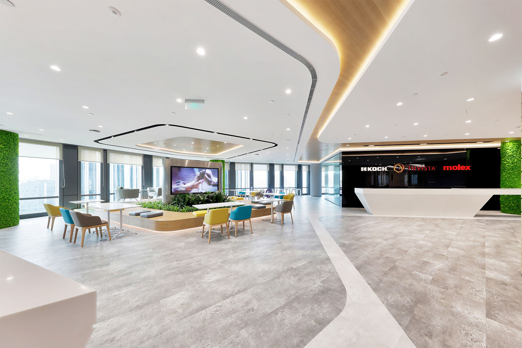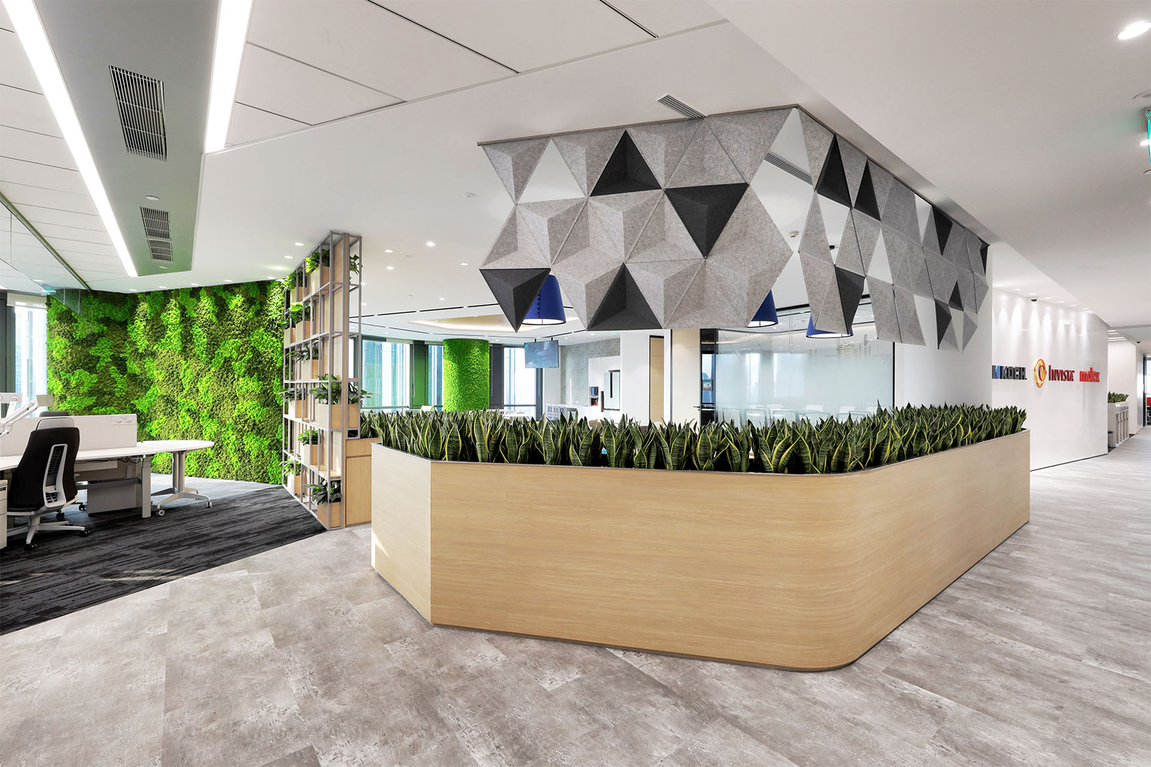 Invista and its group of companies have over 130,000 employees worldwide, working to improve life’s essential products – things like food, clothing, water, transportation and technology. So when they were looking to consolidate their operations in one location in Shanghai, China, they partnered DB&B to transform the way they work and enable a workspace that drives innovation, promotes a sense of belonging and employee wellness. For this 45,000 square feet, double floor space, Invista aimed for it to be home to a big family. This new workspace would be fresh, vibrant and open to encourage collaboration.
