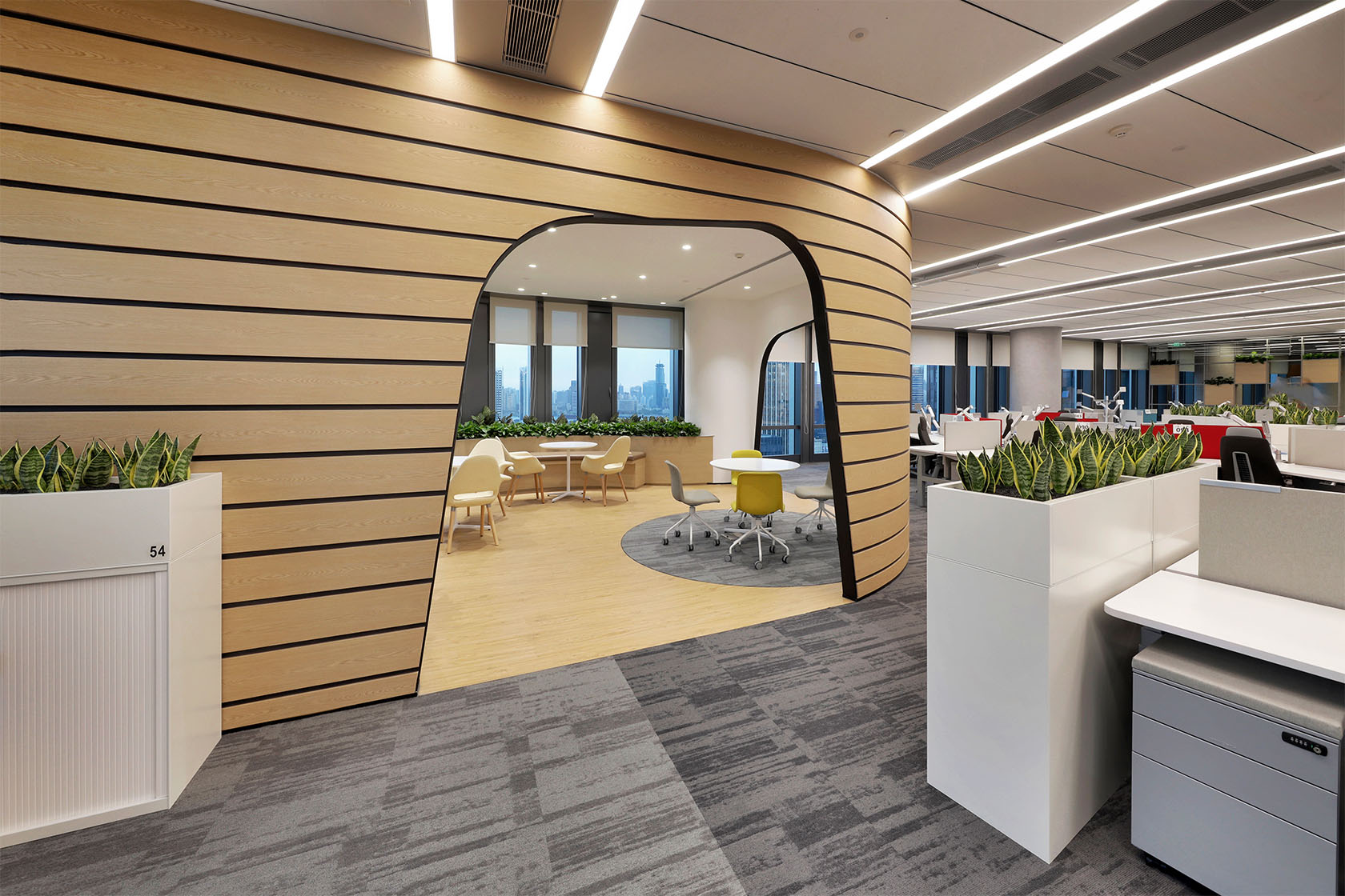 Designed with flexibility and collaboration in mind, the open workspace is equipped with 120-degree workstation, interspersed with design aesthetics and different forms of collaborative furniture which offers modularity and ergonomics to ensure well-being of employees. In accordance with the function and the proportion of people, the enclosed meeting rooms in different locations are allocated for employees in the different zones. Work areas are planned as self-serving ‘neighbourhoods’ to have sufficient amenities and facilities.