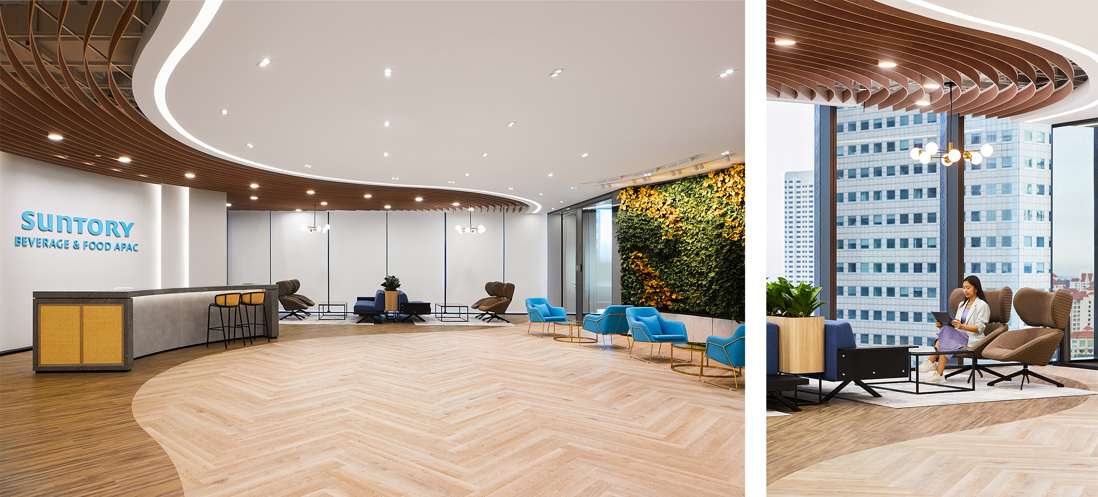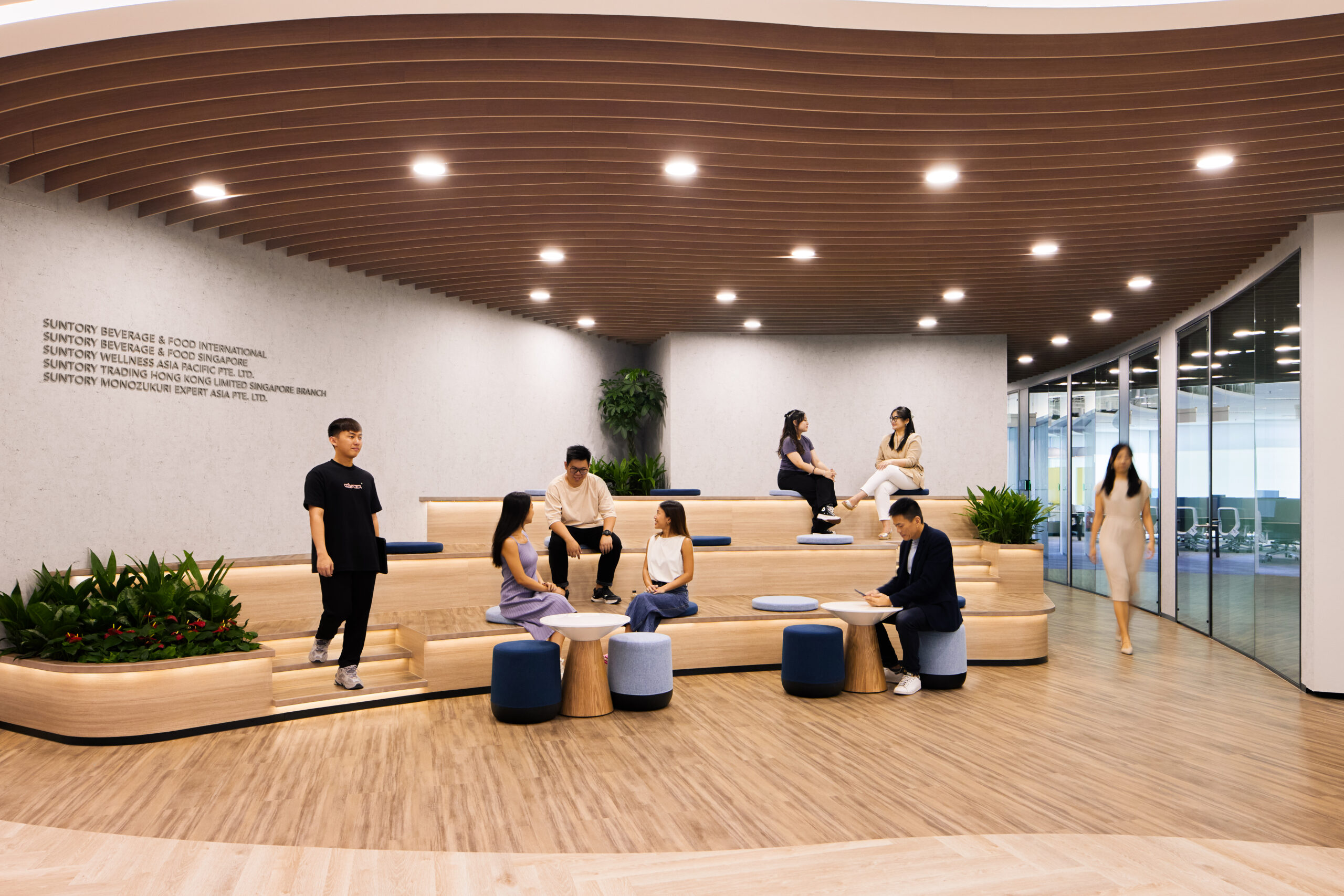The reception features a Suntory logo with debossed signage set in a textured wall, symbolising a strong and reliable image. The use of natural materials such as wood and incorporation of greenery into the reception create a soothing environment that aligns with Suntory’s dedication to sustainability.