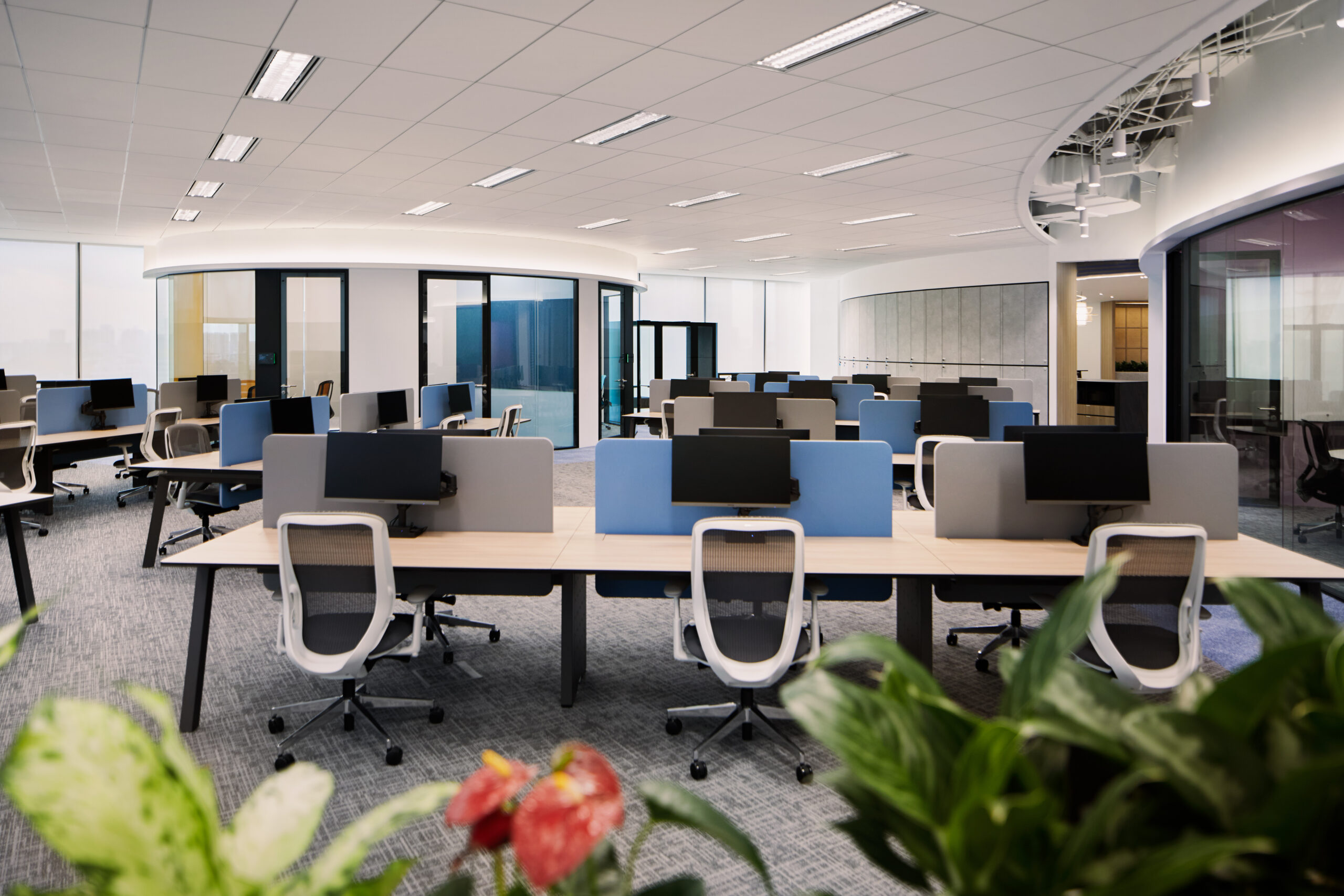 Suntory’s new workspace conveys a sense of fluidity and equilibrium with the incorporation of circular features, ripple patterns and flowing waves, along with the application of Suntory’s brand colours.