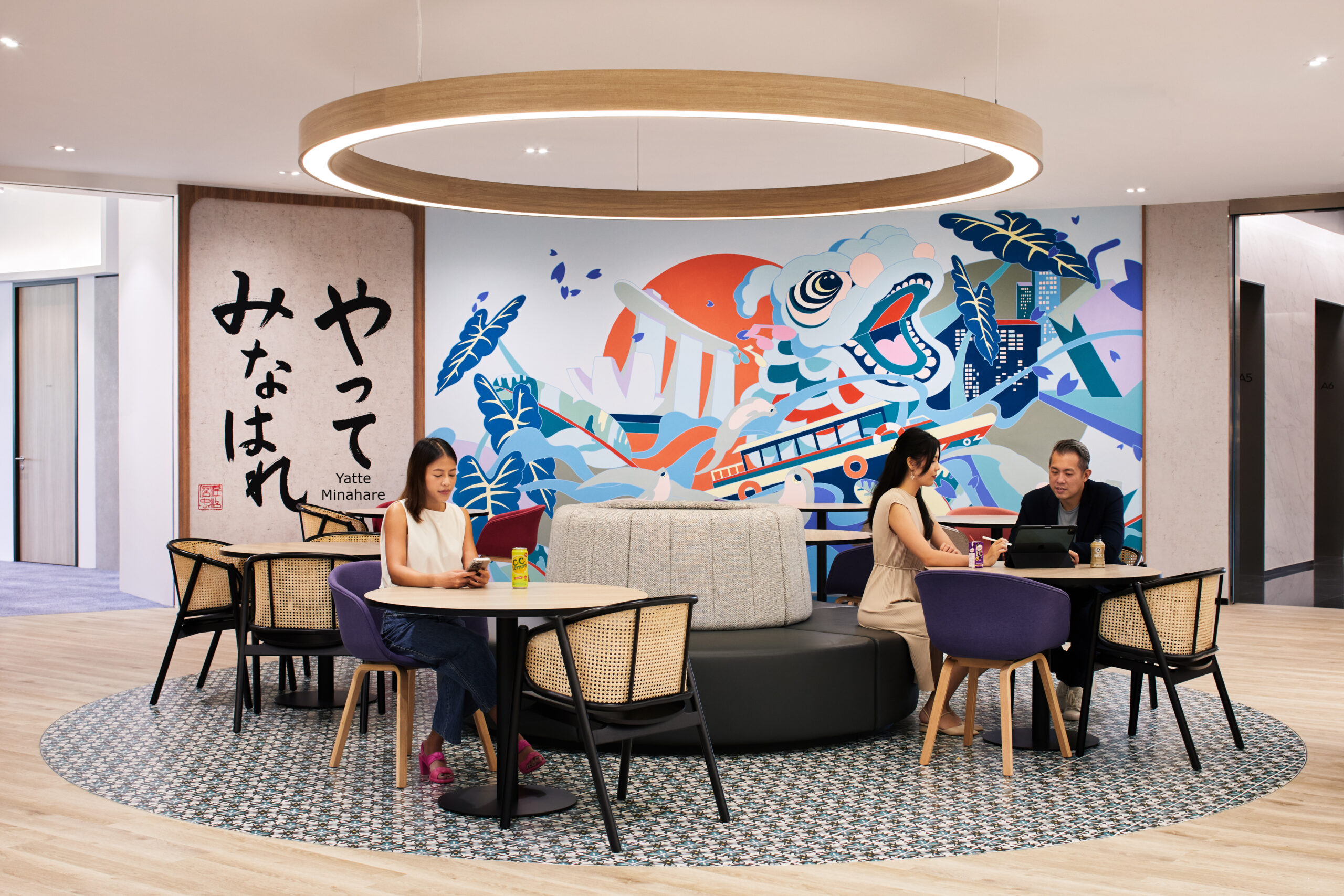 We envisioned a space that conveyed a sense of fluidity and equilibrium. Incorporating circular features, ripple patterns and flowing waves, along with the application of Suntory’s brand colours, helped unify the entire space. The deliberate absence of sharp corners also helped create an open and interconnected environment.