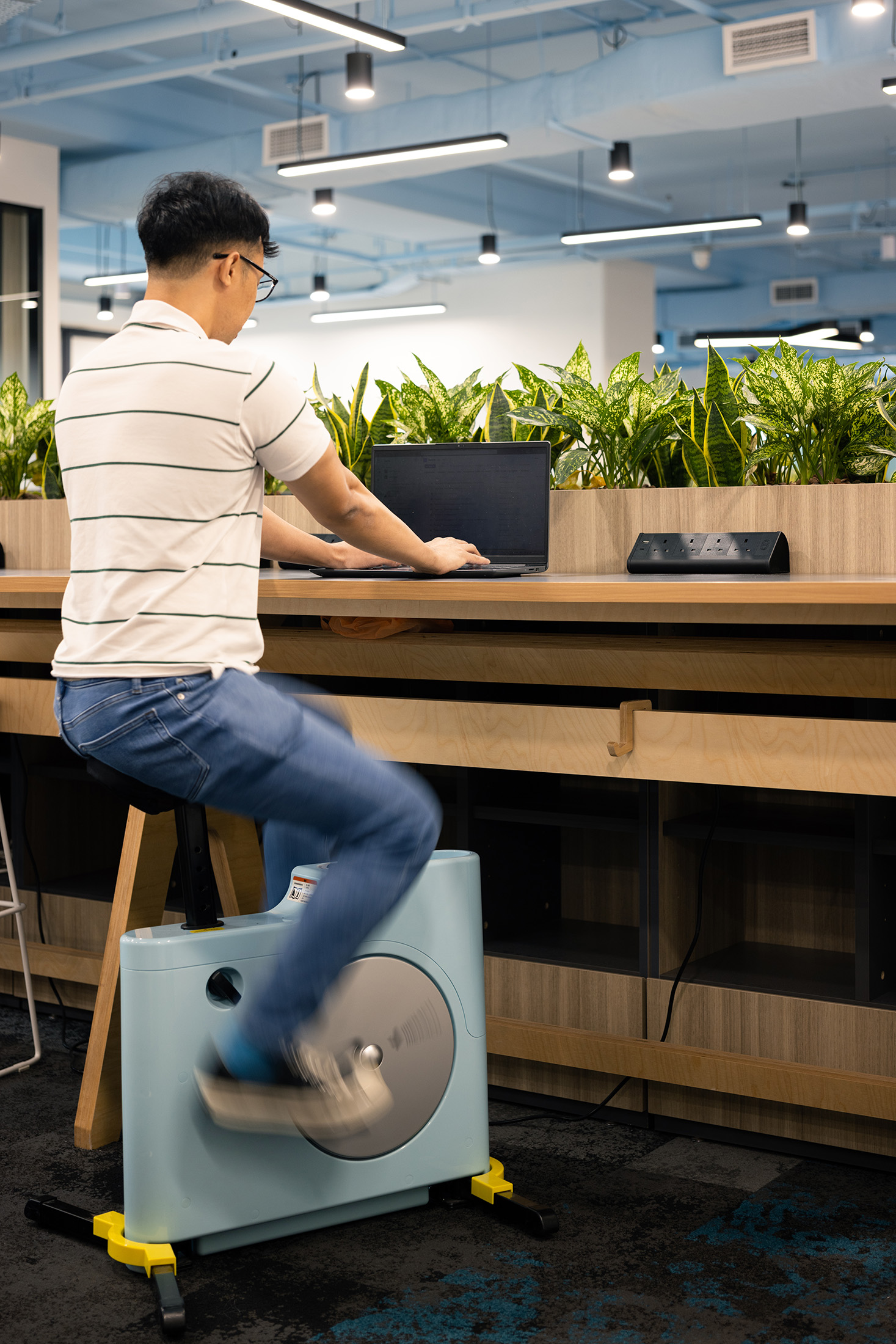 Alternative seating such as bar seats equipped with exercise bikes are available for employees doing agile work.