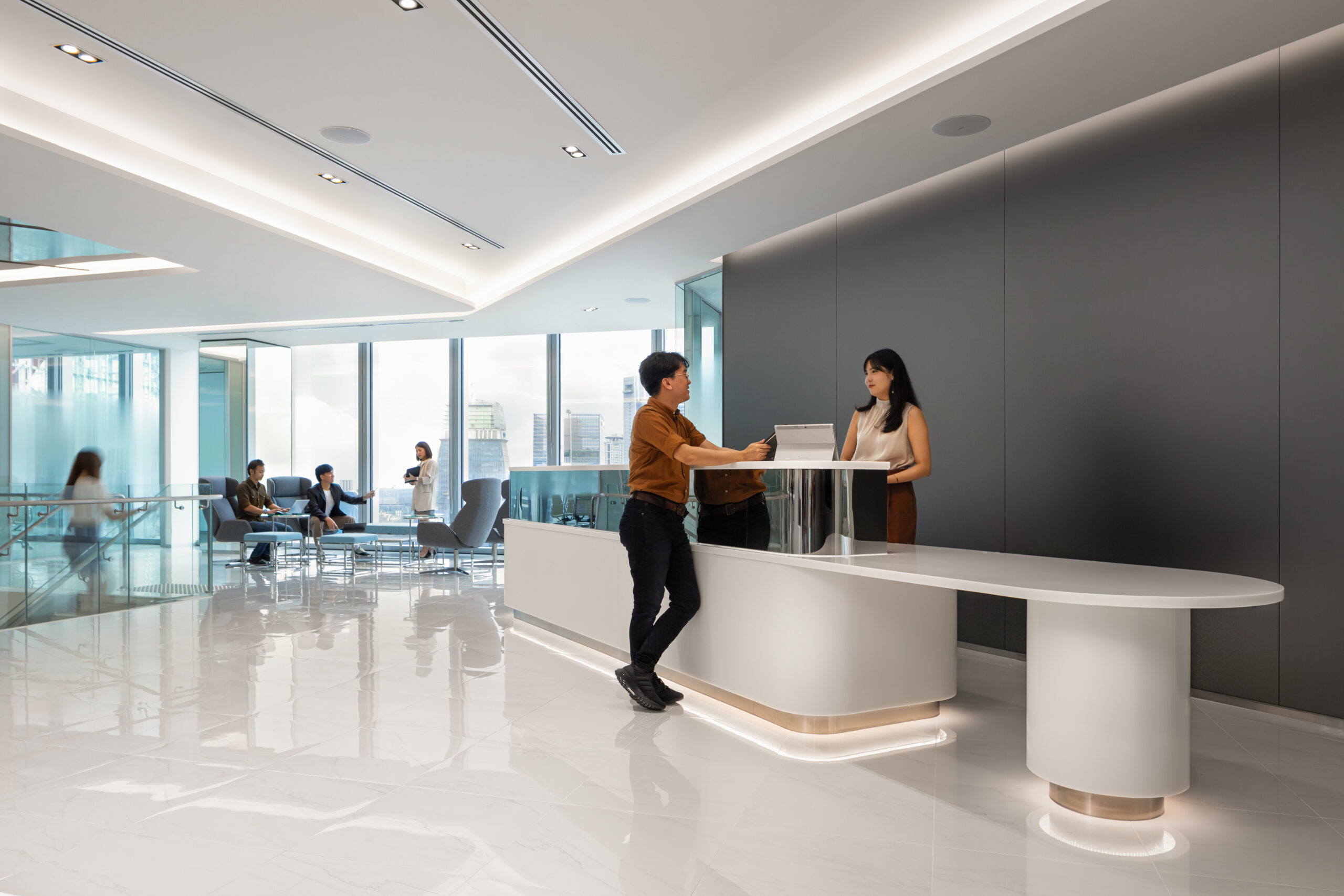 Inspired by the archetypes of their global offices and designed to emphasize their professionalism, the dual-storey office is treated with a clean, white palette with subtle pops of colours to bring focus to the things that matter. Textures are injected through the use of acoustic panels, or choice of furniture materials. This theme of astute professionalism is consistently reflected throughout the office.