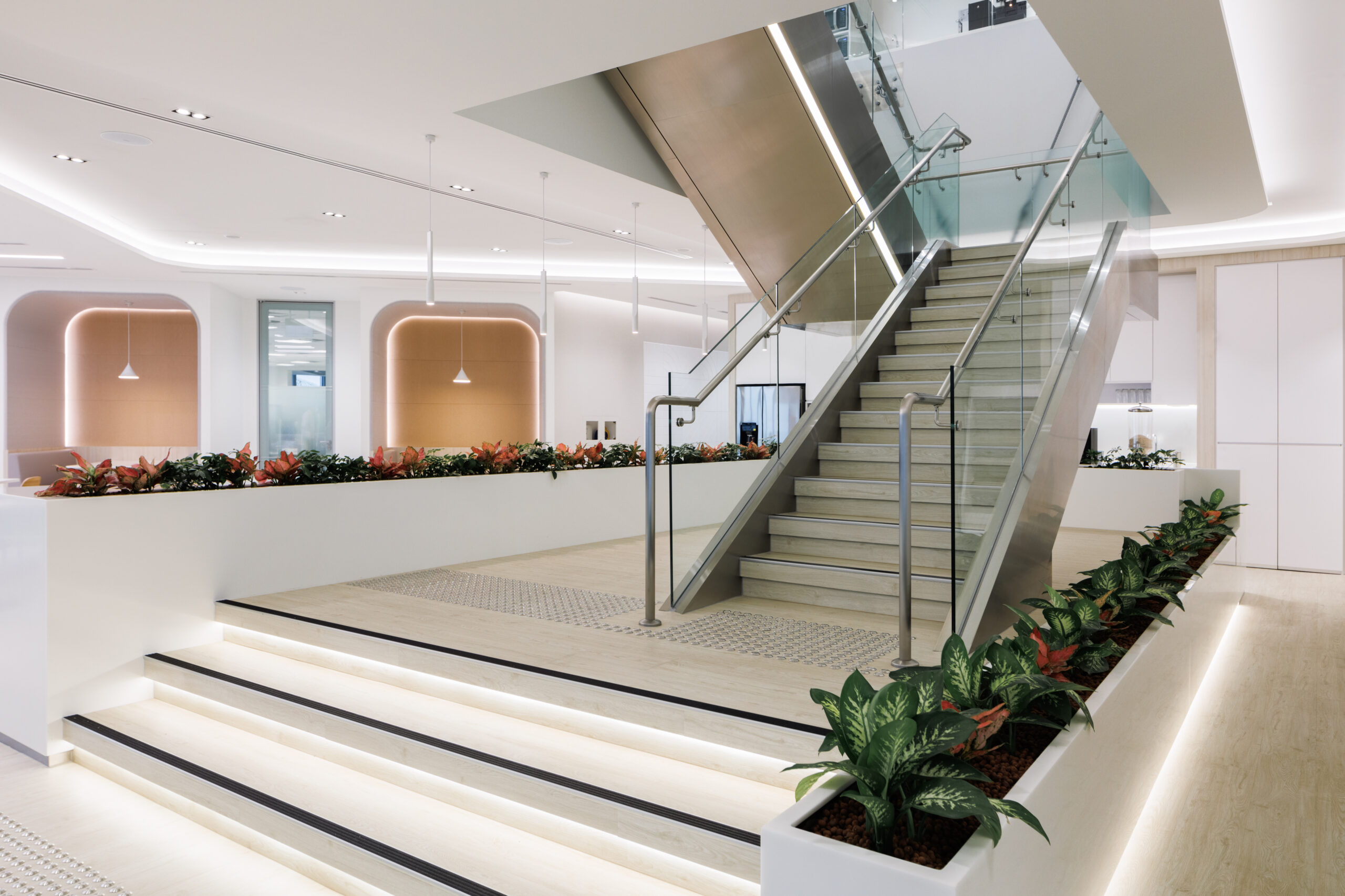 As they traverse across the floors at the connecting stairs, they are greeted by a generous bed of ferns that add vibrancy to the office space. The staircase is designed with glass panels to depict a connected illusion between the floors. It also allows natural light to pour into the space freely, creating a sense of openness.