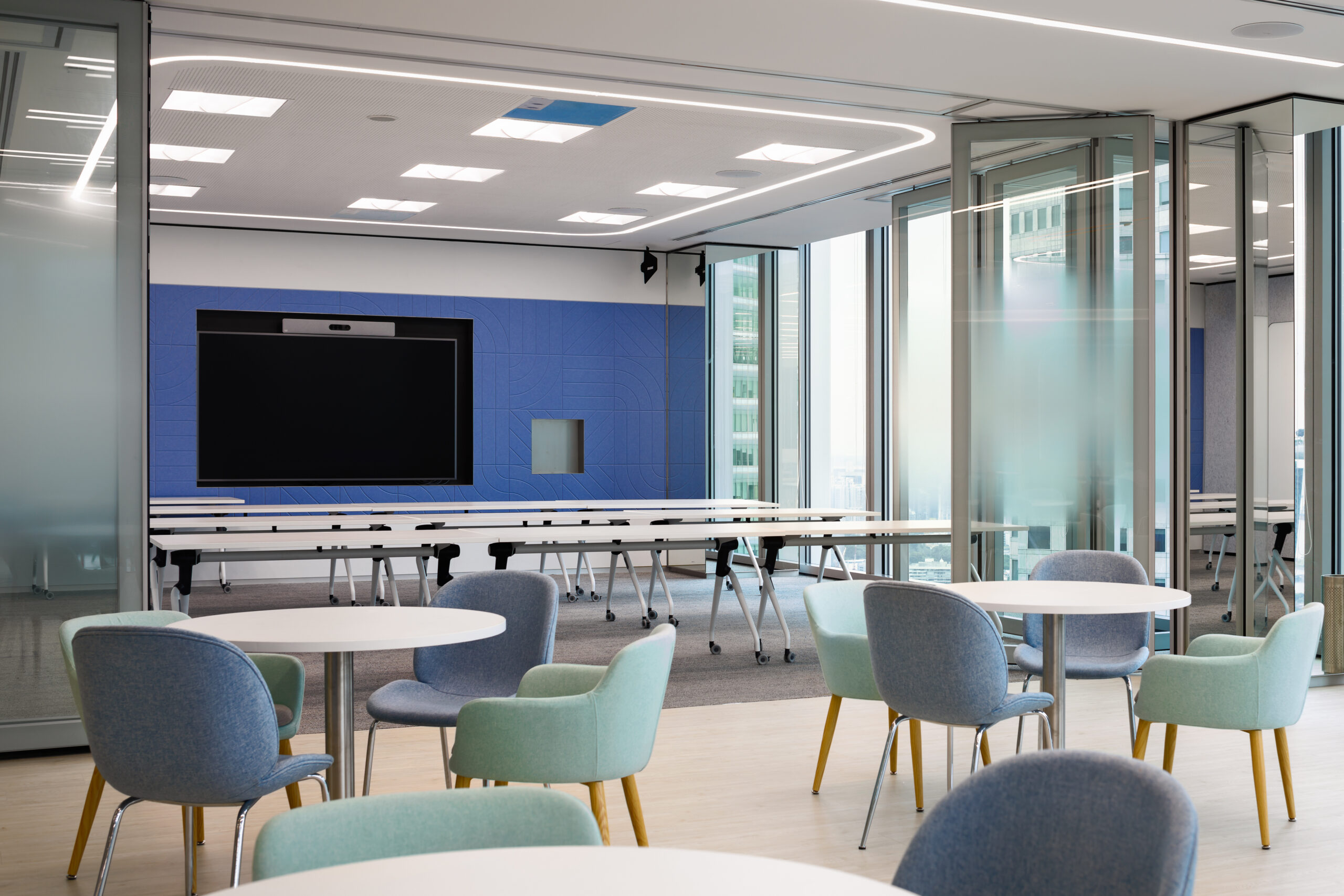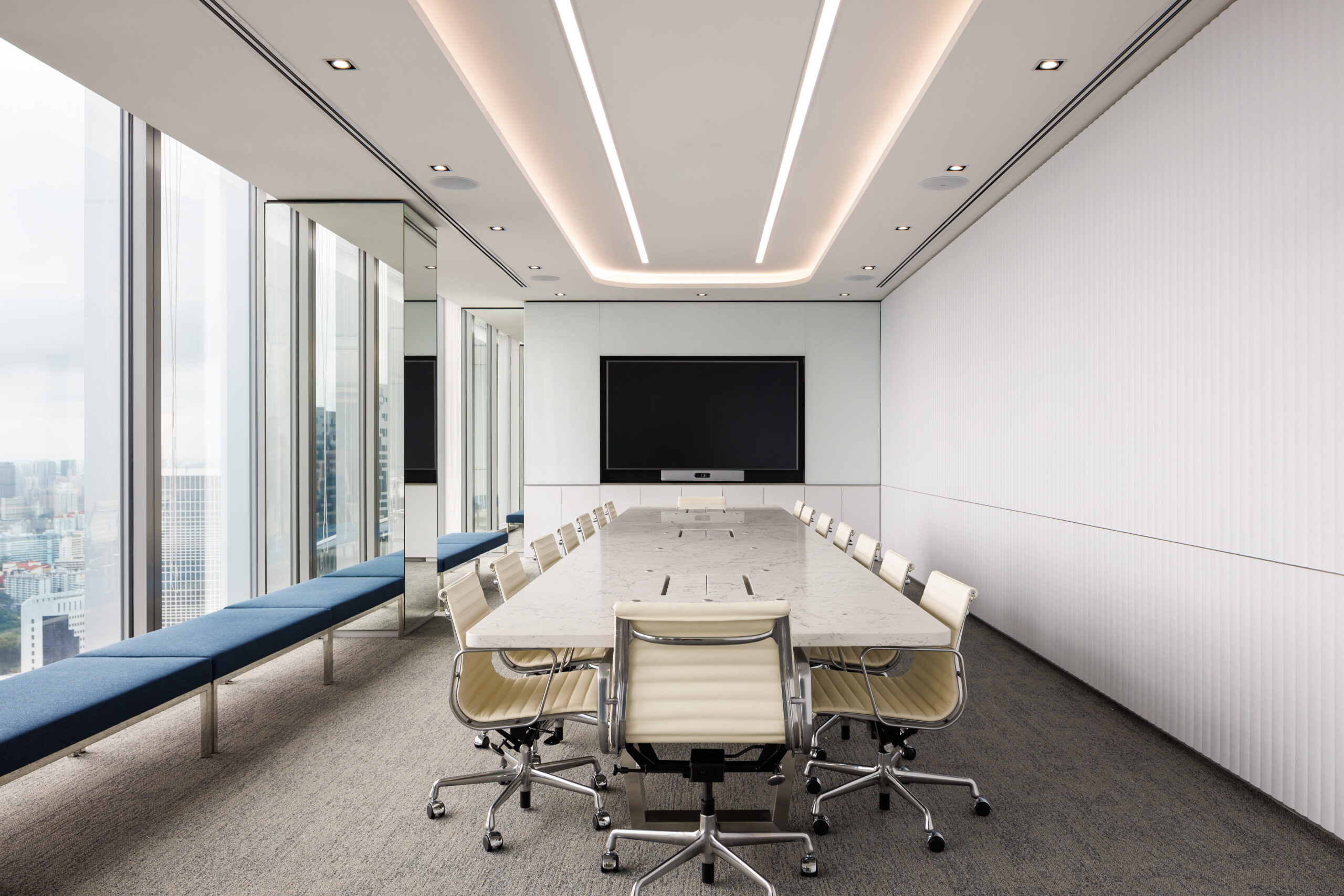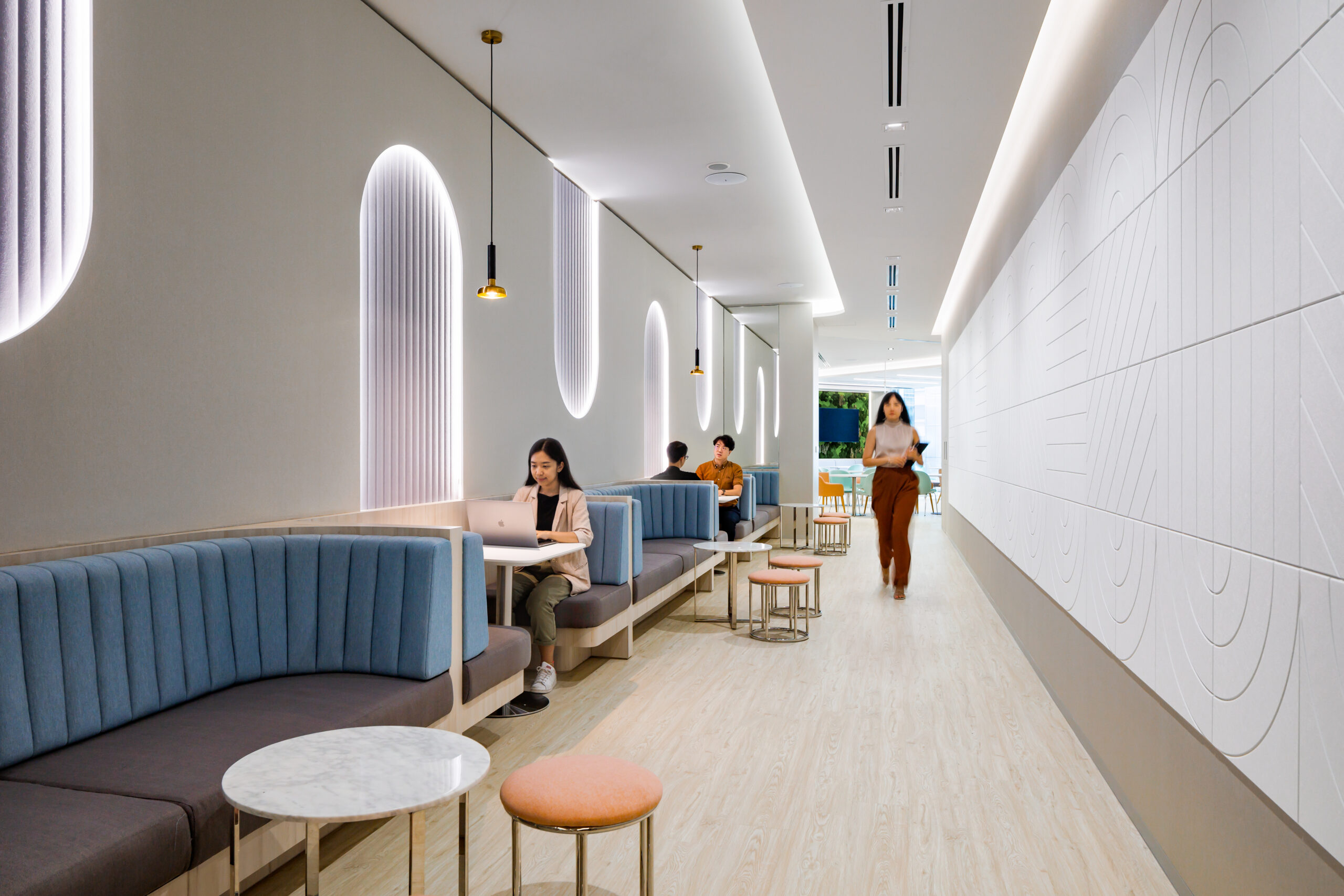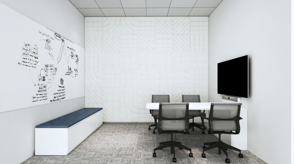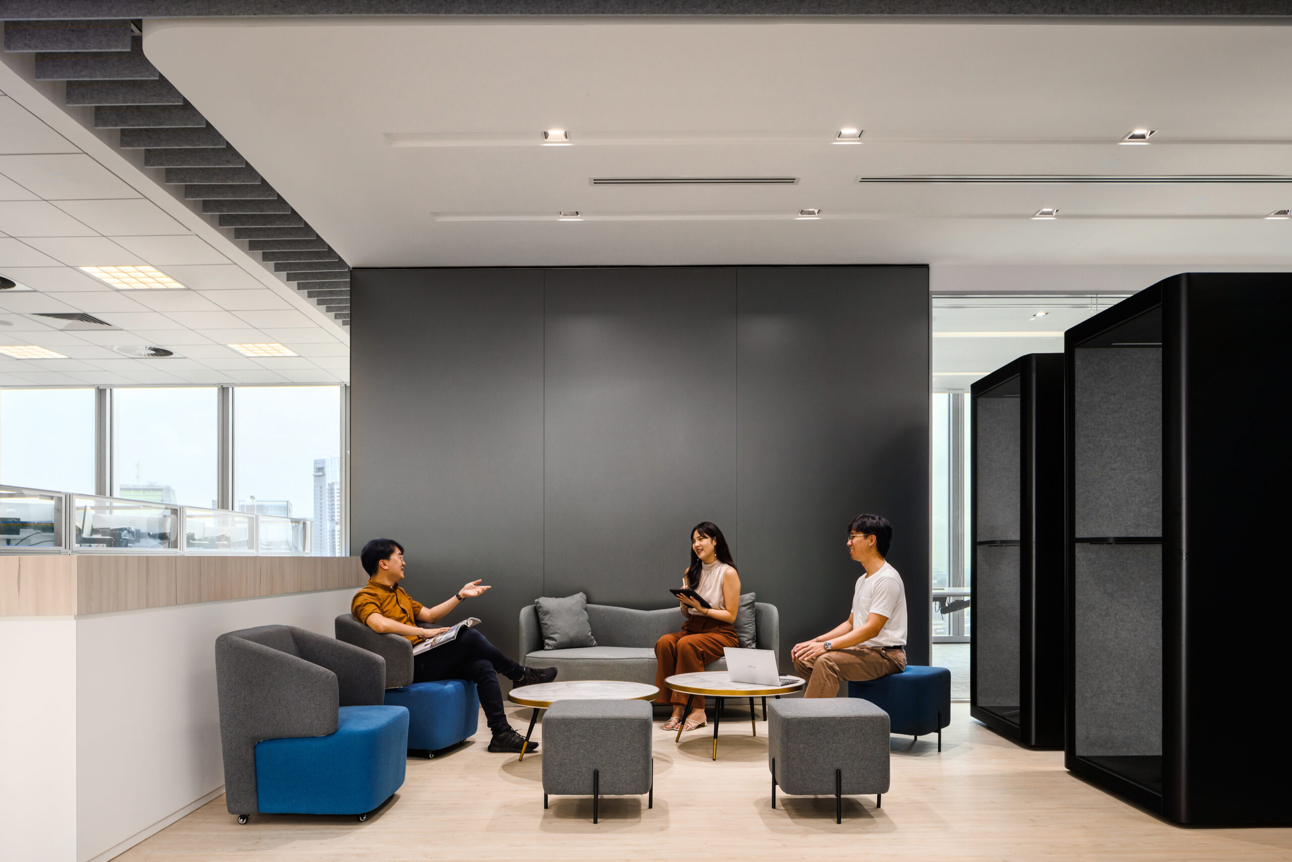 To facilitate confidential discussions, the core of the floorplate is lined with enclosed meeting rooms labelled as ‘Team Rooms’. These multifunctional rooms can be easily converted to individual offices by shifting the loose furniture around, and repositioning the computer screens. To keep this space flexible, electrical wiring concealed within the acoustic panels and walls are designed to accommodate various configurations without the need to overhaul the space.