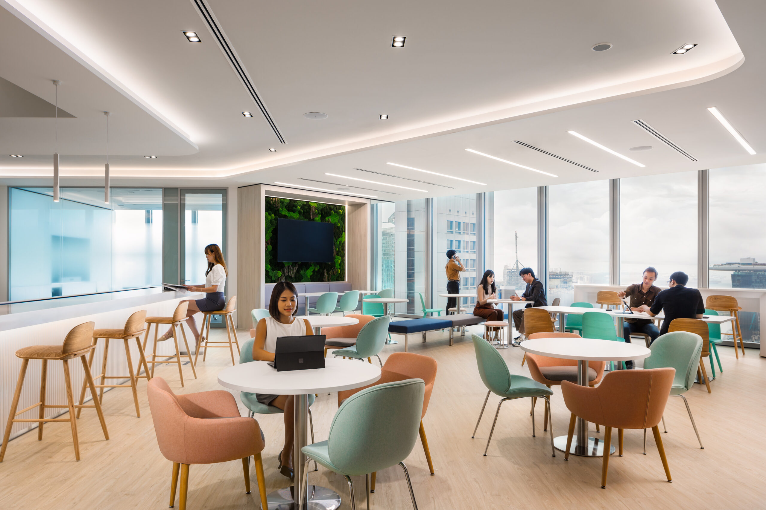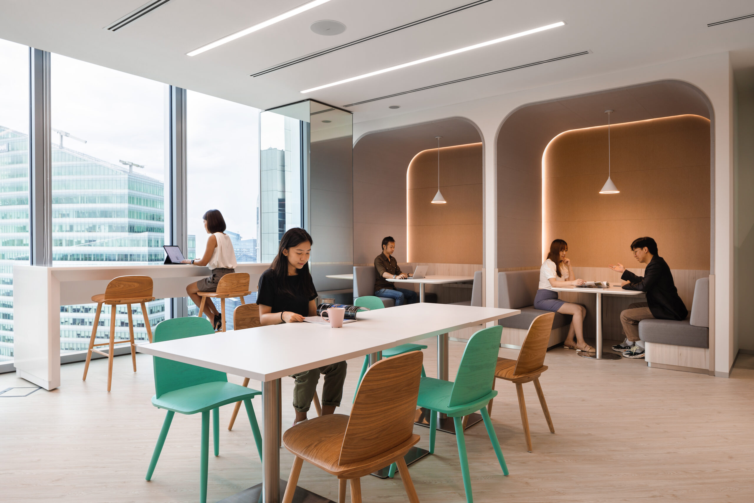 This space offers a variety of seating options – bar counter seats, table seats, booth seats and also sofa seats. Employees who enjoy natural light would gravitate towards the window seats, while booth seats would be the choice for those who prefer a semi-private setting.