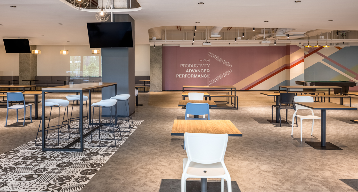The café is an impressive space which can accommodate ASM’s growing workforce. Such spaces, once thought of as just a space for meals, have now become alternatives for townhalls, collaboration, and socializing. Seating options are plentiful – ranging from long communal tables to high benches and booth seating. To offer spatial demarcation, DB&B playfully mixed accent tiles with vinyl flooring of different colours to create zones. A pool table and table tennis table are also thoughtfully accessible for employees to recharge their minds.